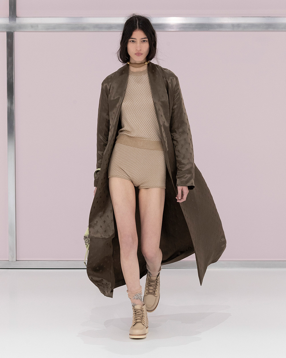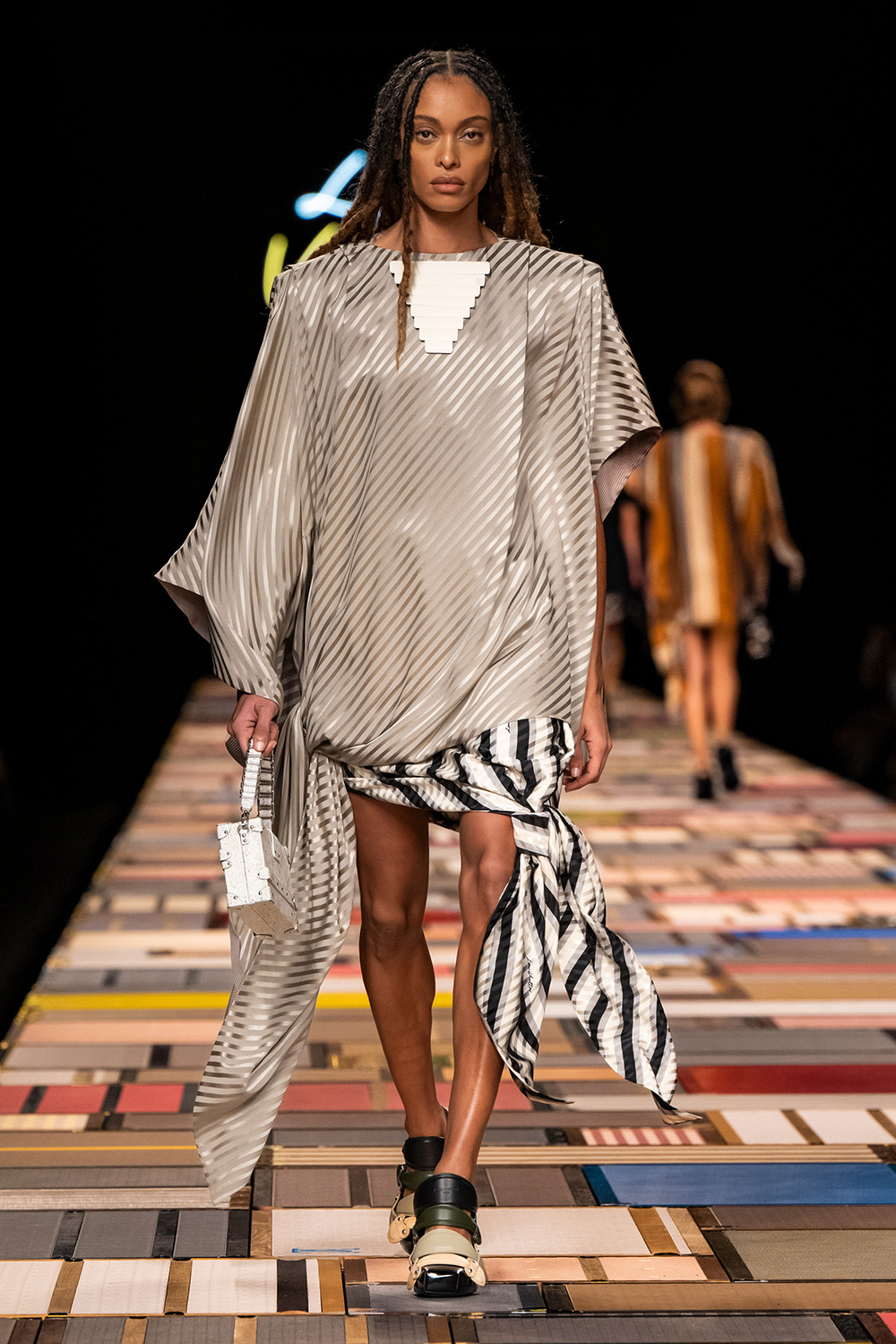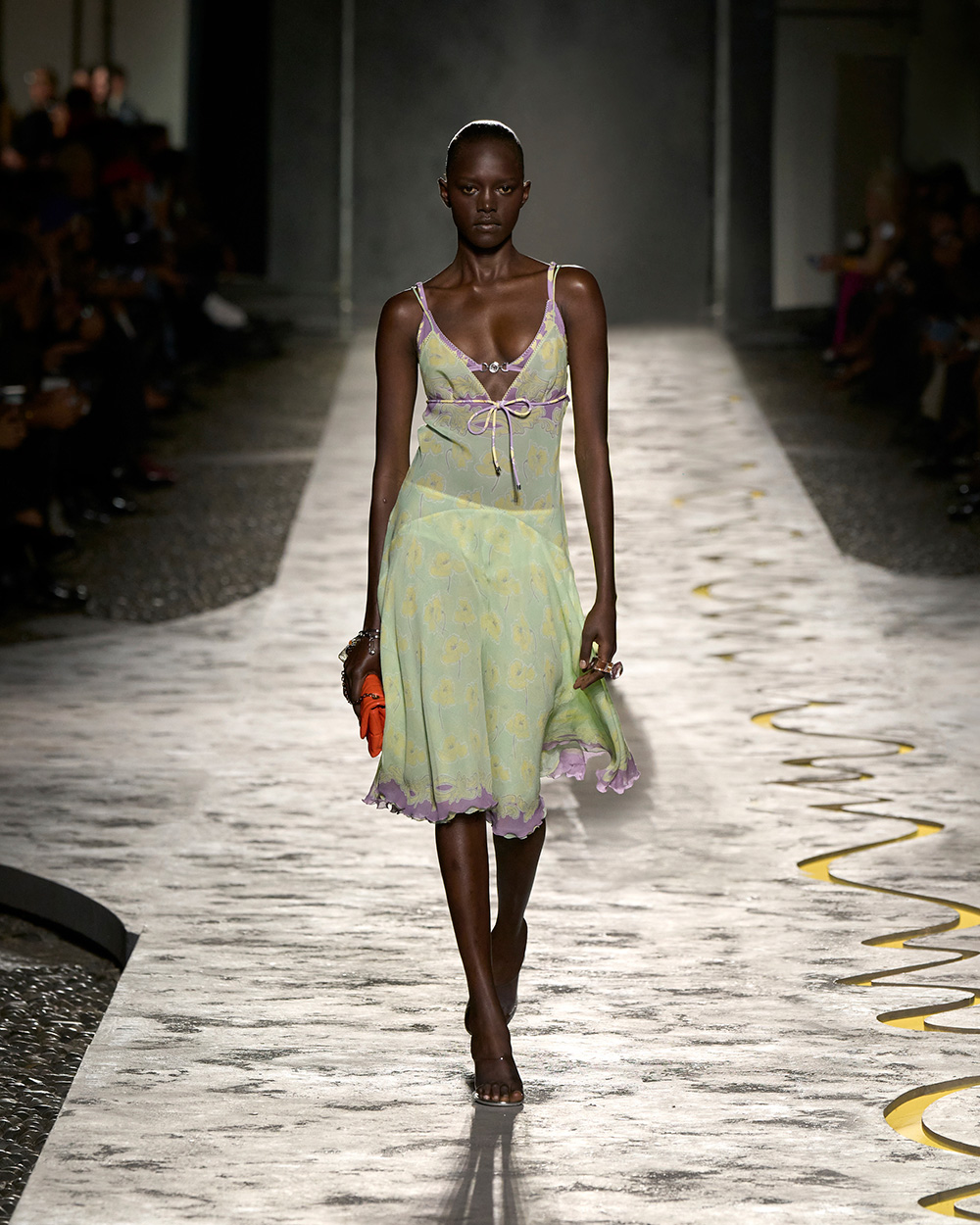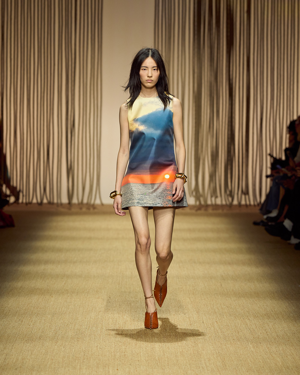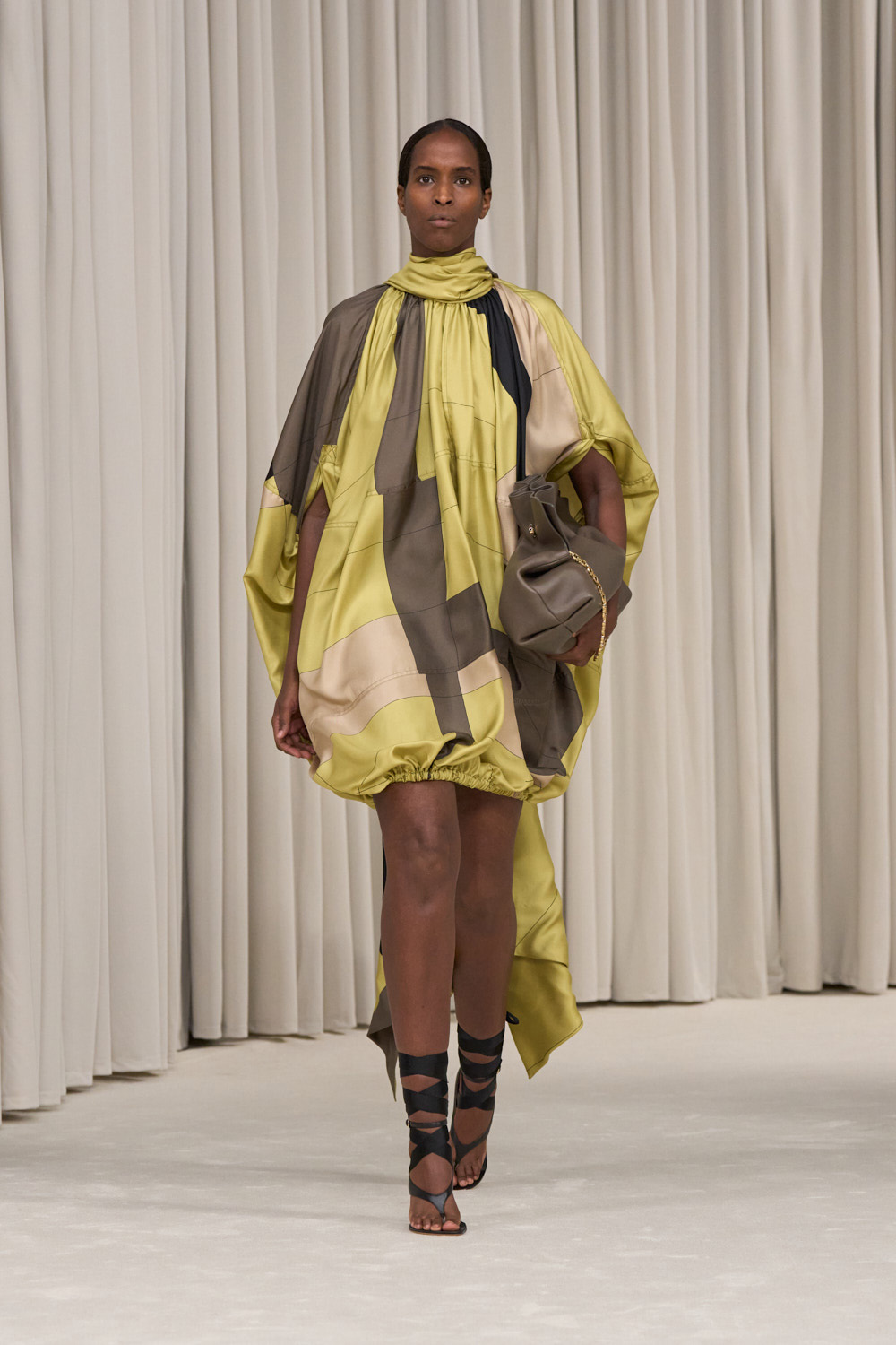 ドレスやスカートを中心に、上品な光沢と滑らかさを併せ持つシルキーな素材も見られた。「ルイ・ヴィトン(LOUIS VUITTON)」や「フェラガモ(FERRAGAMO)」など、美しいドレープやヒラヒラ揺れる裾、綺麗な発色、スカーフ風プリントを生かしたデザインが際立つ。