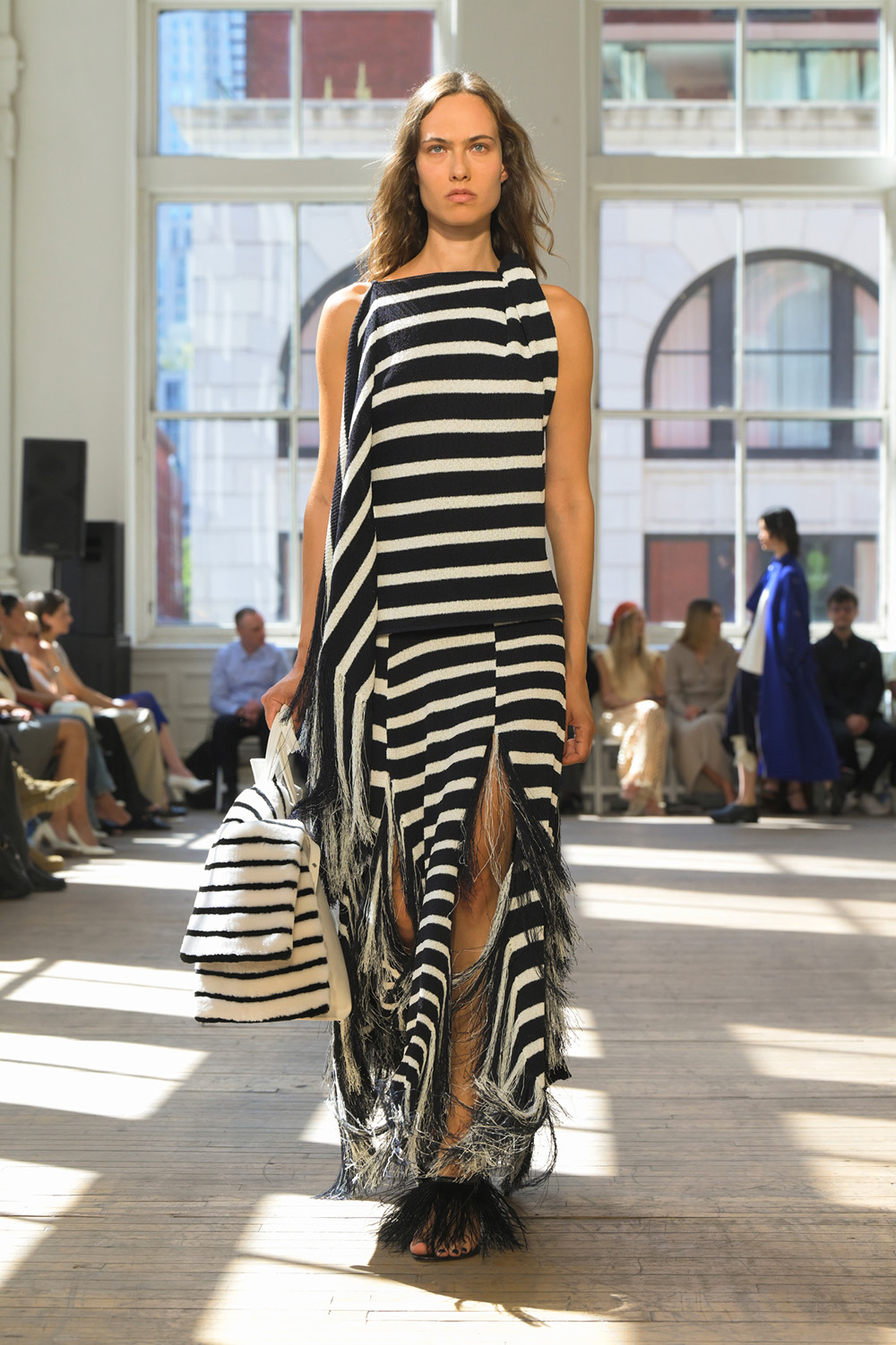 ストライプは、ビジネスウエアに見られるハンサムな柄が目立つ。そのままスーツやシャツに用いるだけでなく、多様なアイテムに落とし込まれているのが特徴。「ケイト(KHAITE)」は、紺地のピンストライプをオーガンジーにのせて軽やかに仕上げた。
