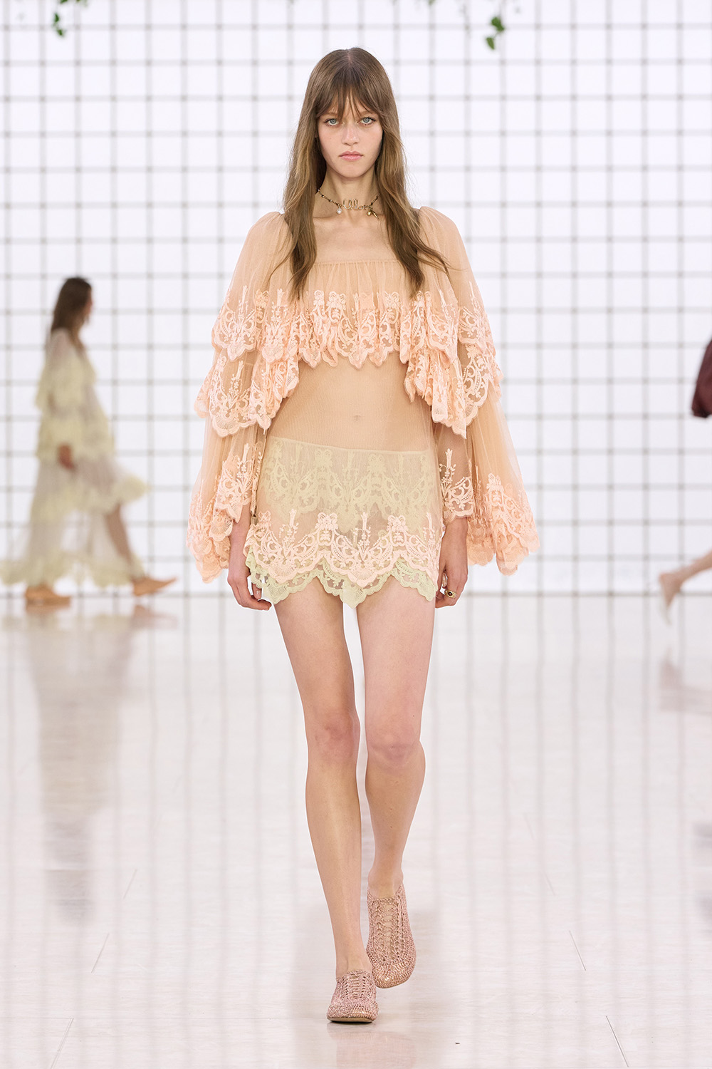 シアー素材と並んで、レースは今季のロマンチックやフェミニンなムードを表現するために必須。繊細な模様だけでなく、素朴なアイレットレースもある。また、「マックイーン(McQUEEN)」はクモの巣のようなデザインで甘さの中に毒気をプラス。
