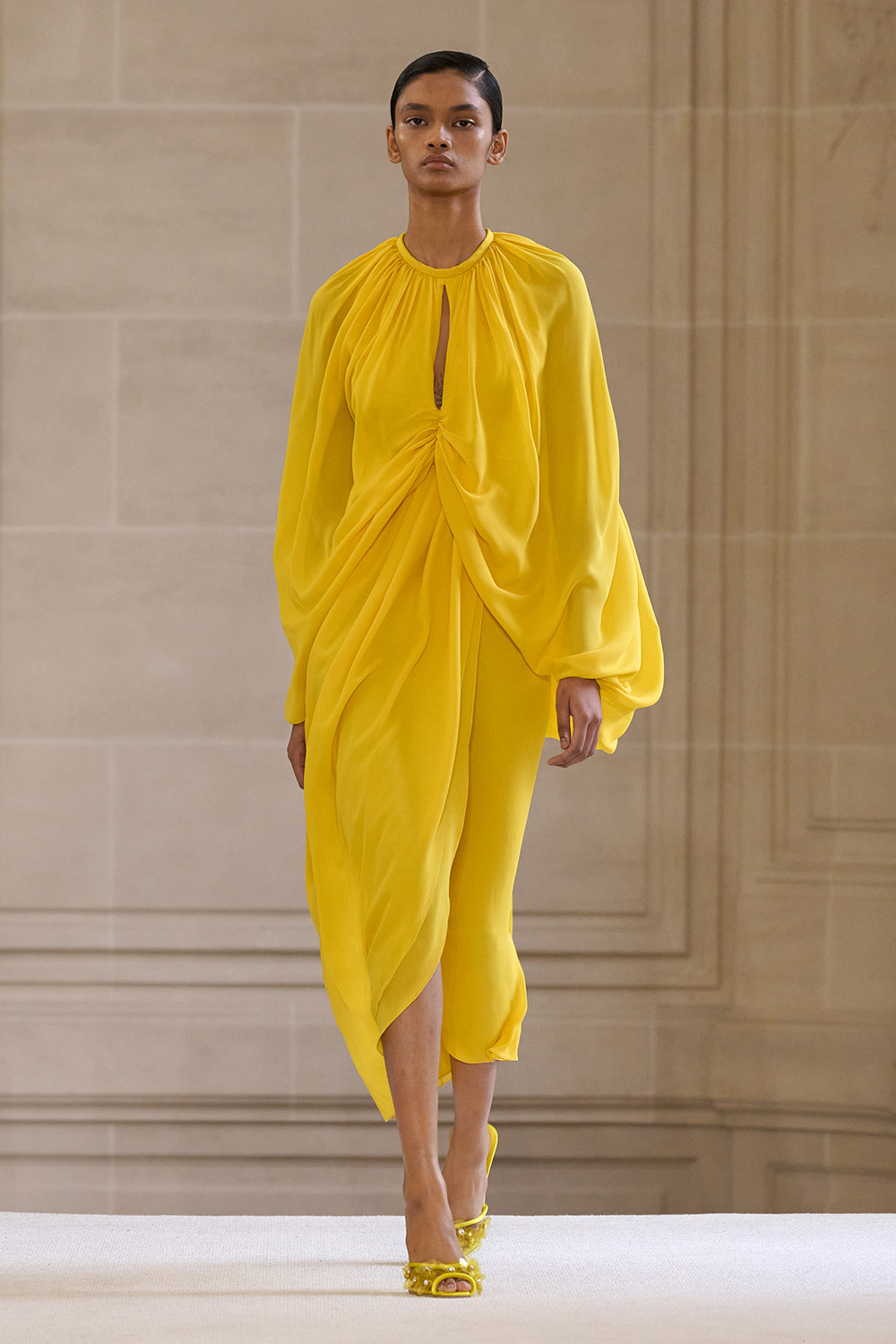 パステルは毎シーズン登場するが、今季は日に焼けて褪せたような少しくすみのある淡い色合いが特徴。シアー素材との組み合わせが多い。注目は、「クロエ(CHLOE)」や「アクリス(AKRIS)」が用いたピンクやピーチ、アプリコット、イエローなどの暖色系。