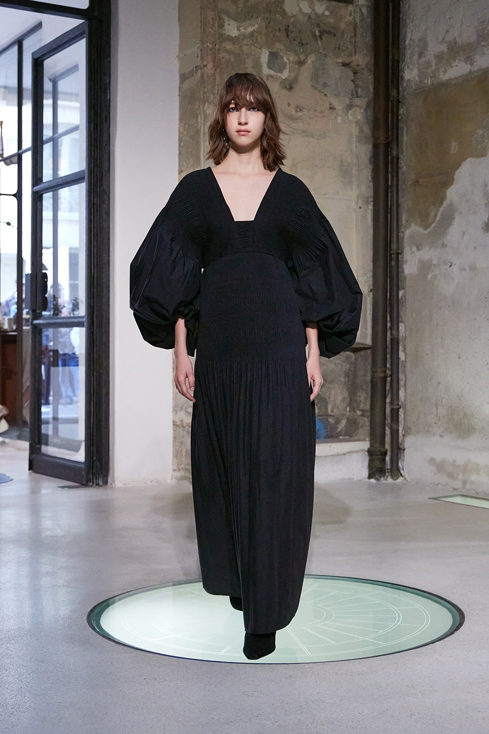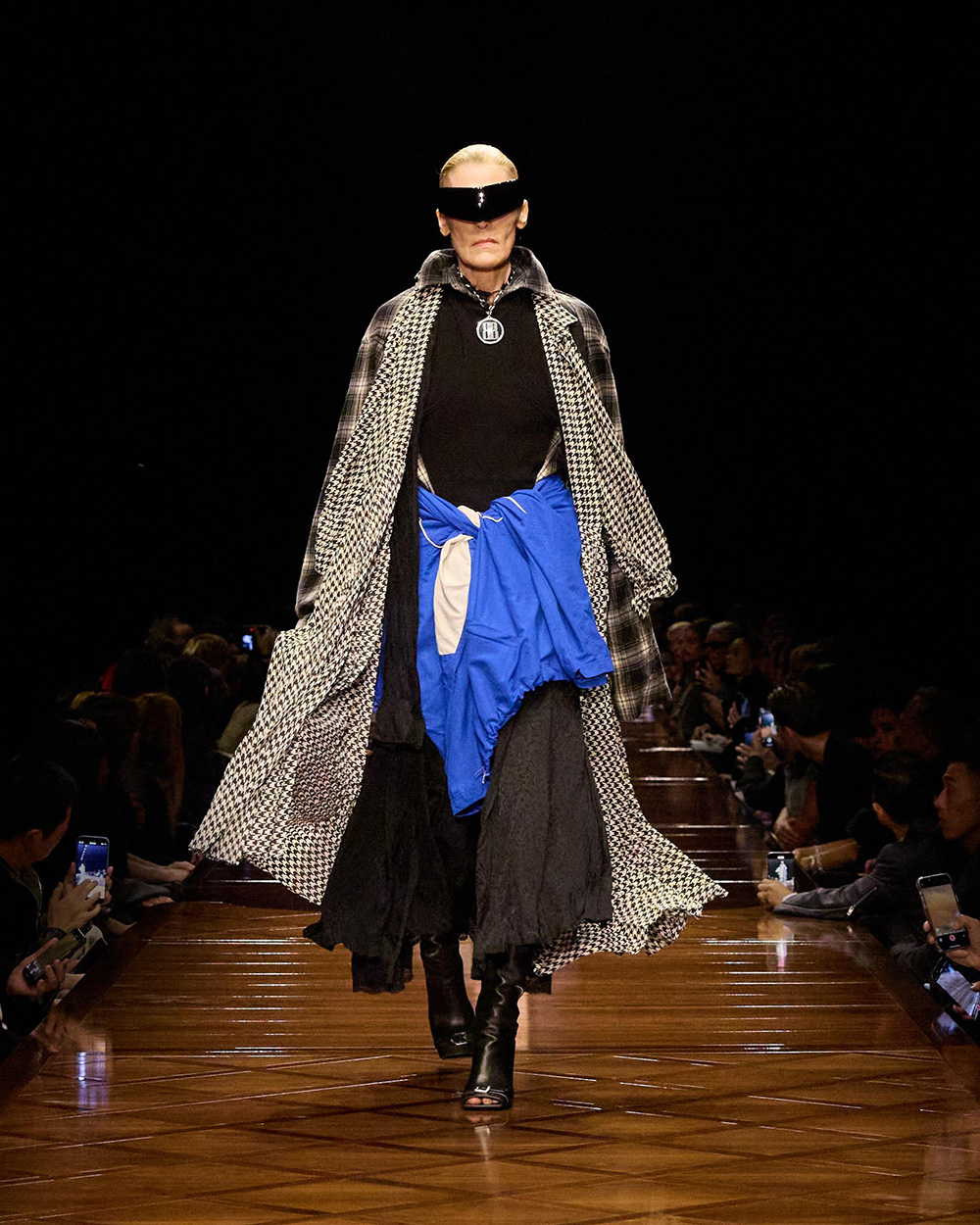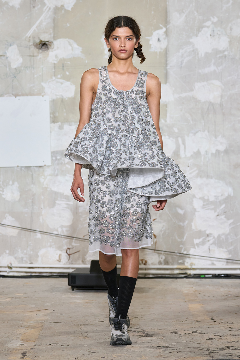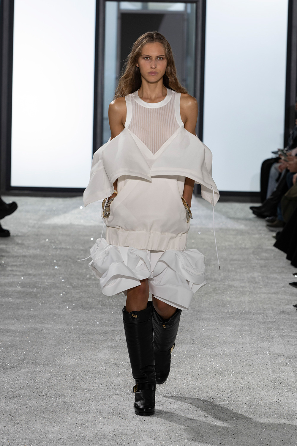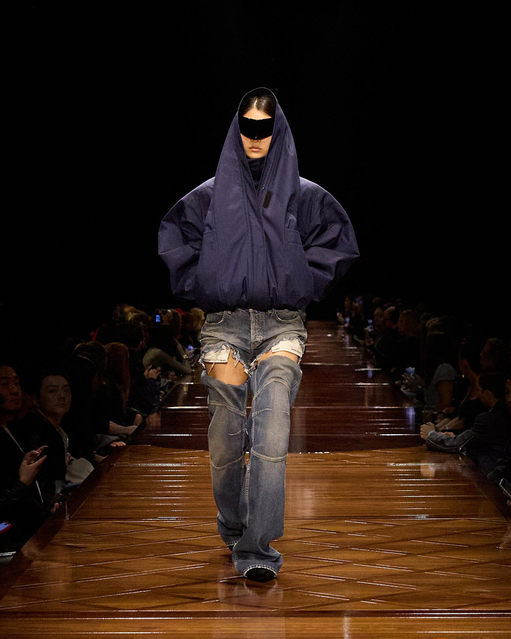 今季は削ぎ落としたデザインや見慣れたアイテムをベースにしながら、存在感を放つ構築的なシルエットを探求するアプローチも際立った。「バレンシアガ(BALENCIAGA)」や「クレージュ(COURREGES)」は、メゾンのアーカイブに見られるコクーンシェイプを日常着で再解釈。「サカイ(SACAI)」はテーラードジャケットやフーディの一部をずらしたり剝がしたりすることで、新鮮なボリュームを生み出した。風船のように大きく膨らんだボトムスや袖、ペプラム風のデザインも増えている。
