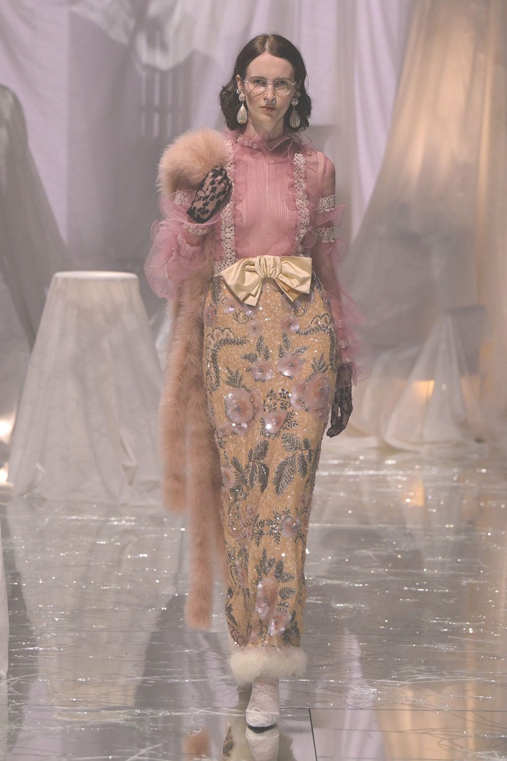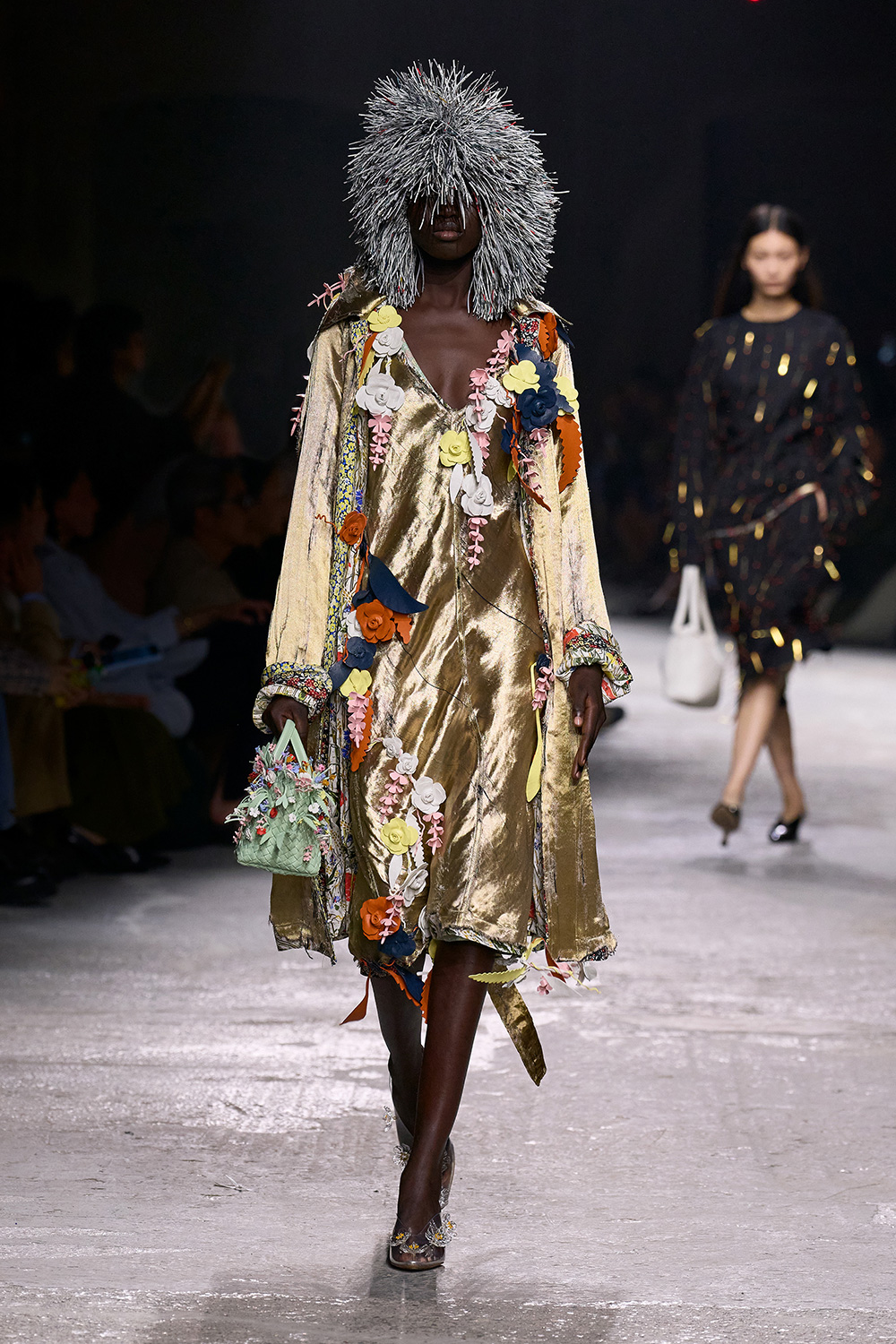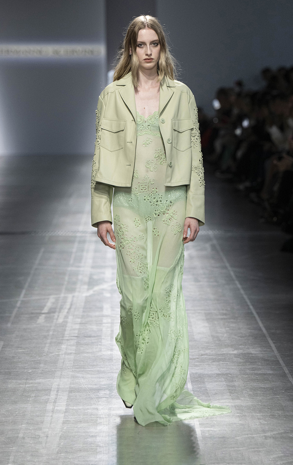 数シーズン続いたクワイエット・ラグジュアリーの勢いは落ち着き、装飾主義が再び盛り上がりそうだ。この流れをけん引するのは、アレッサンドロ・ミケーレ(Alessandro Michele)による新生「ヴァレンティノ(VALENTINO)」。それだけでなく、ミラノやパリを中心に、ブランドそれぞれの技巧や背景を生かした装飾表現も目立った。手法は、複雑な刺しゅうや輝くフリンジ、贅沢なブロケード、レザーで作る立体的な花など。前述のロマンチックなラッフルやフリルも、華やかなムードを演出する。