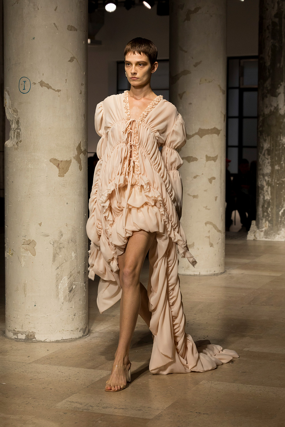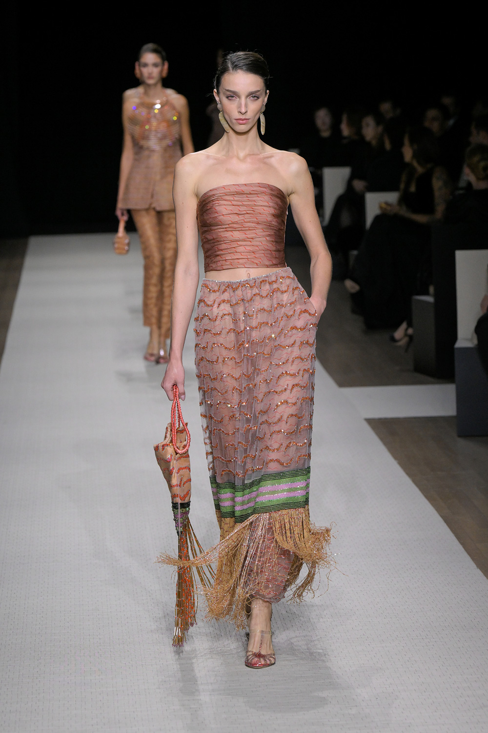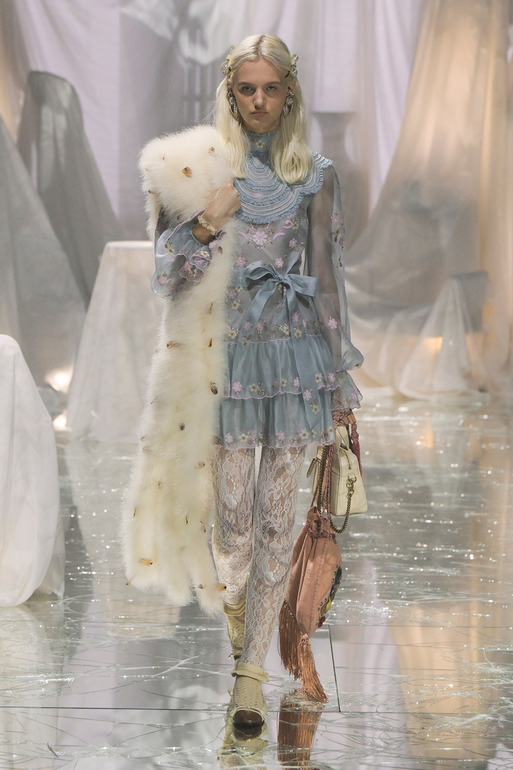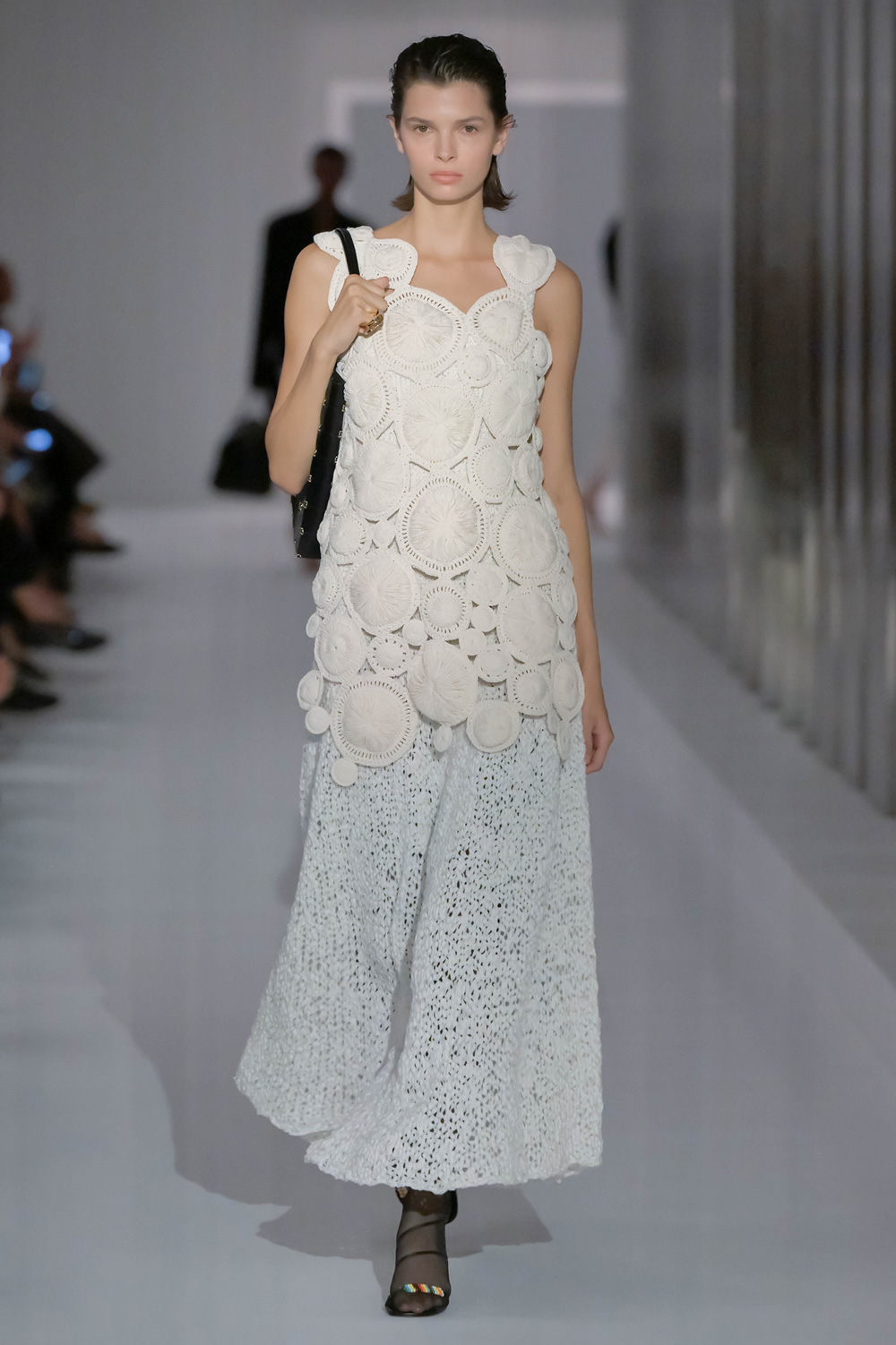 数シーズン続いたクワイエット・ラグジュアリーの勢いは落ち着き、装飾主義が再び盛り上がりそうだ。この流れをけん引するのは、アレッサンドロ・ミケーレ(Alessandro Michele)による新生「ヴァレンティノ(VALENTINO)」。それだけでなく、ミラノやパリを中心に、ブランドそれぞれの技巧や背景を生かした装飾表現も目立った。手法は、複雑な刺しゅうや輝くフリンジ、贅沢なブロケード、レザーで作る立体的な花など。前述のロマンチックなラッフルやフリルも、華やかなムードを演出する。