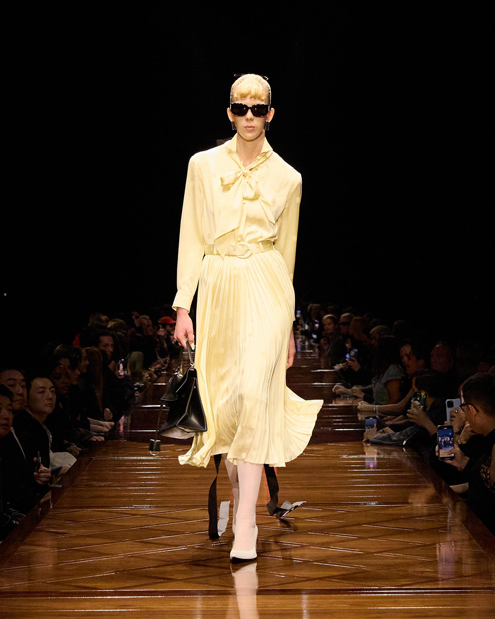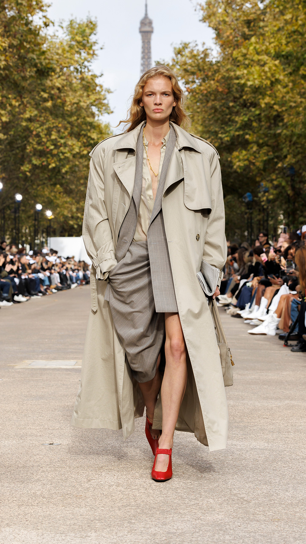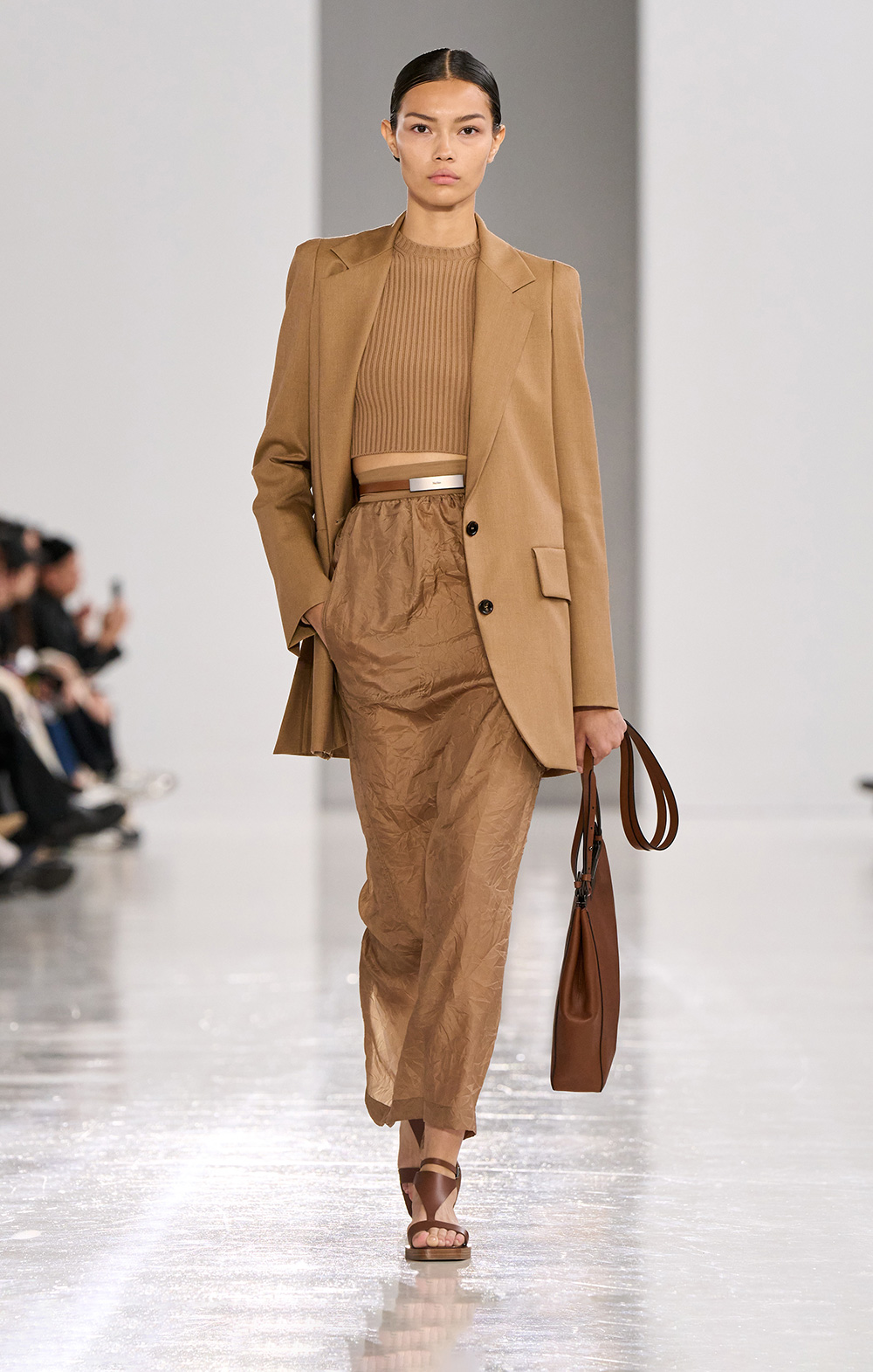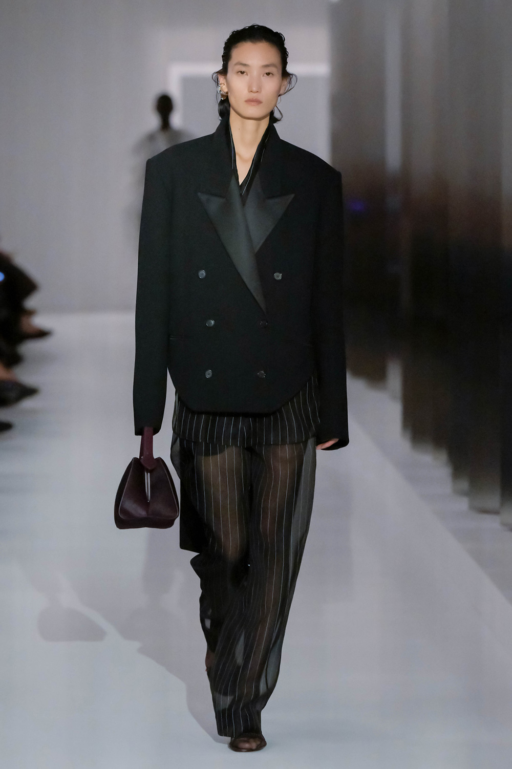 フェミニンな傾向が強まる一方、継続トレンドのかっちりとしたテーラリングやオーバサイズのトレンチコートなどハンサムなスタイルを軸にした逞しい女性像の表現も目を引いた。ポイントはコントラスト。シアー素材やランジェリーライクなアイテム、肌見せ、アクセサリーでフェミニンな要素を加えた着こなしが中心になる。ジャケットは、「ケイト(KHAITE)」や「ボッテガ・ヴェネタ(BOTTEGA VENETA)」のようなパワーショルダーや幅広のラペルが特徴のボックスシルエットだけでなく、より細身のラインやウエストをシェイプしたデザインなどバリエーション豊富に。