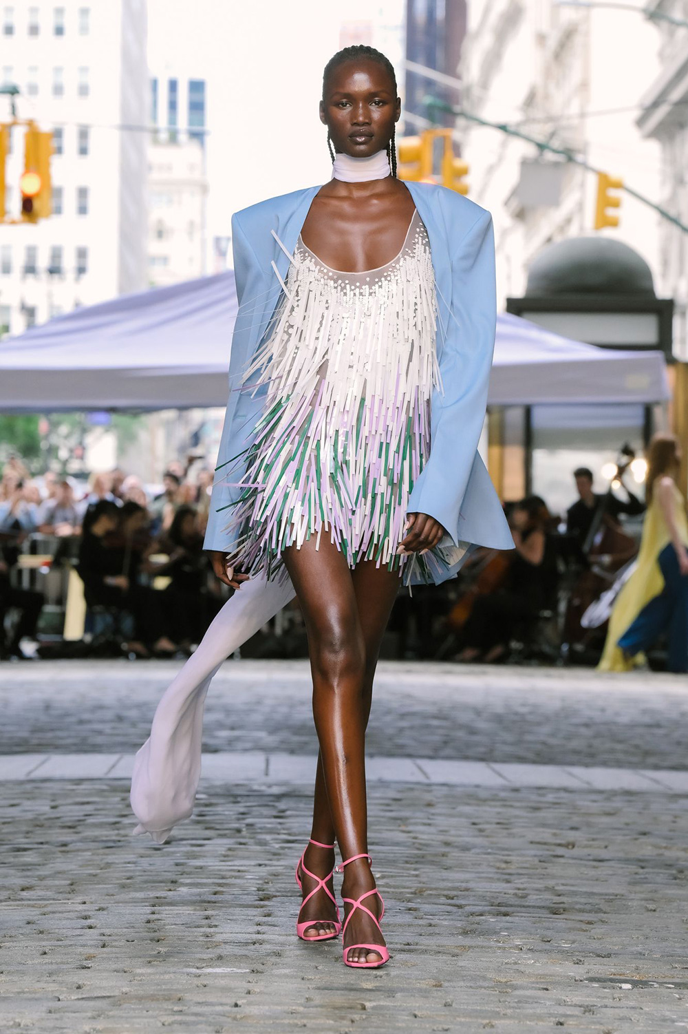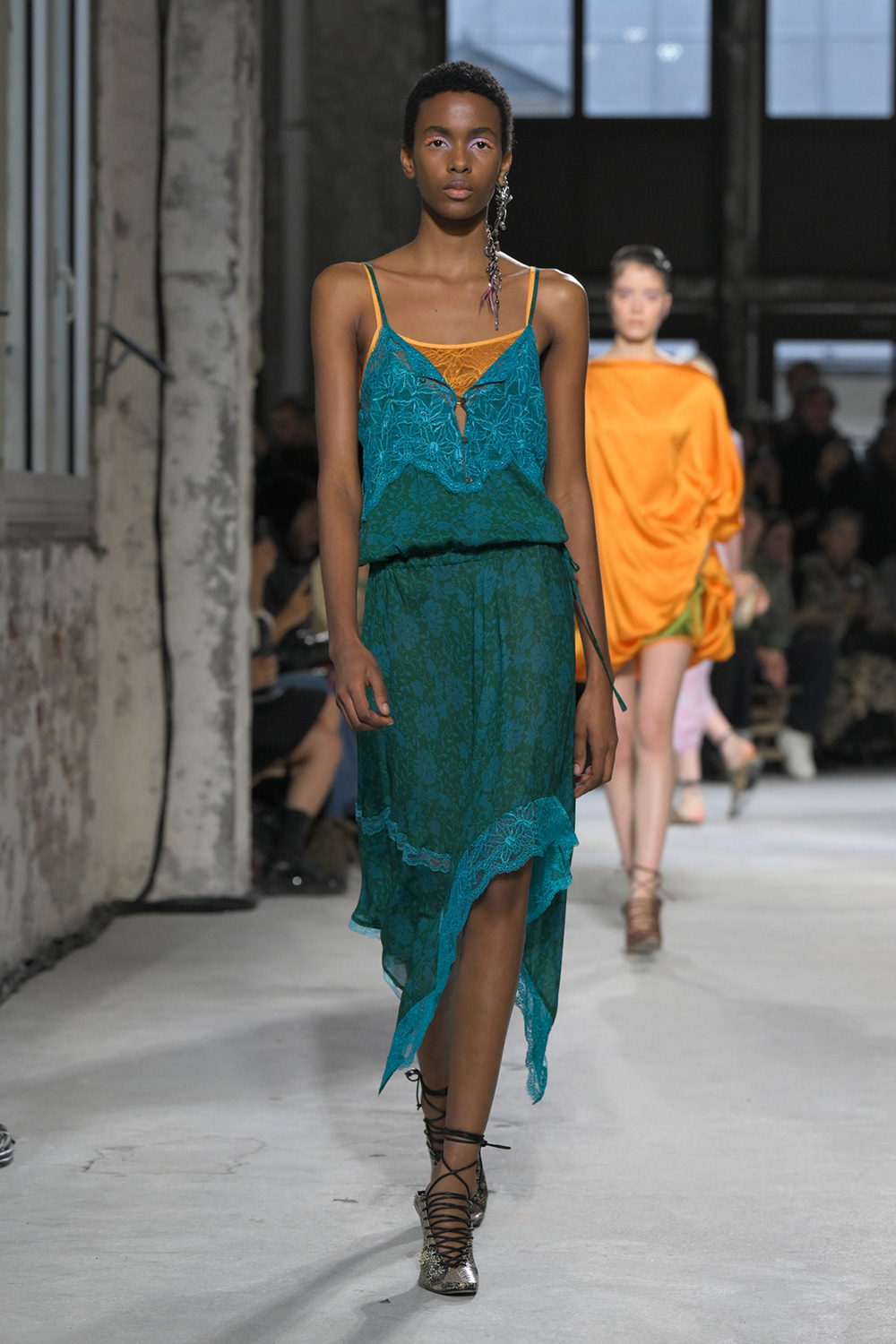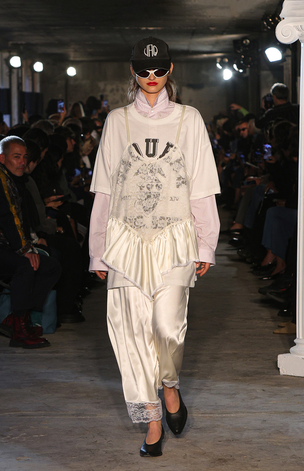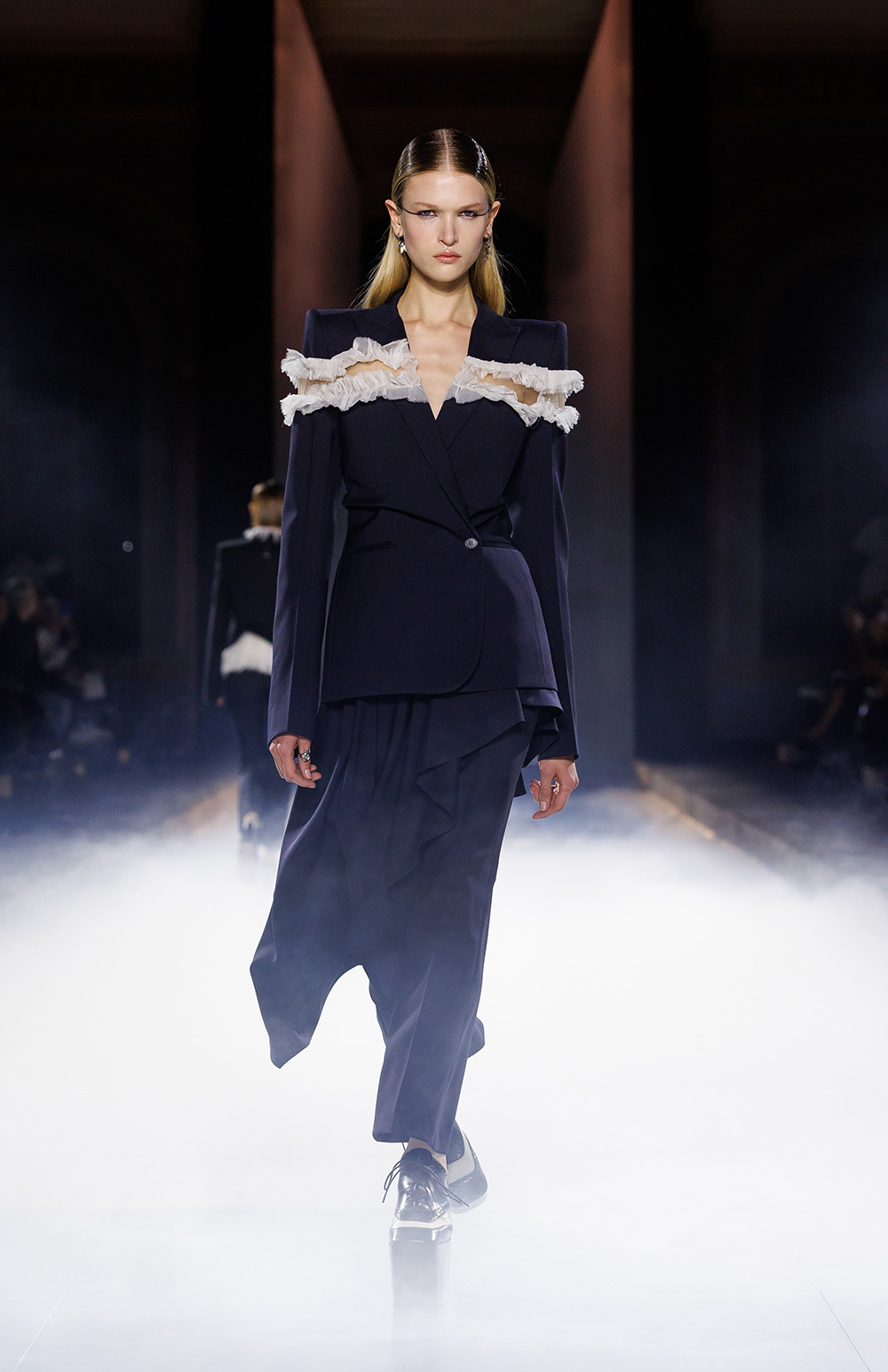 服を通して女性性を讃える提案は引き続き。一つは、ランジェリーライクなアイテムを取り入れて、体のラインや素肌を際立たせたセンシュアル。シックなドレスやスカートスーツで上品さを醸し出すレディーライクも健在だ。そして、今季は「バレエコア」の根強い人気に加え、勢いづくロマンチックムードや装飾主義を追い風にしたガーリーなスタイルが広がった。キー要素は、フリルやパフスリーブ、淡い色、滑らかな素材、キラキラ輝く装飾やアクセサリーなど。リアリティーのあるスタイリングは「ヌメロ ヴェントゥーノ(N°21)」を参考にしたい。