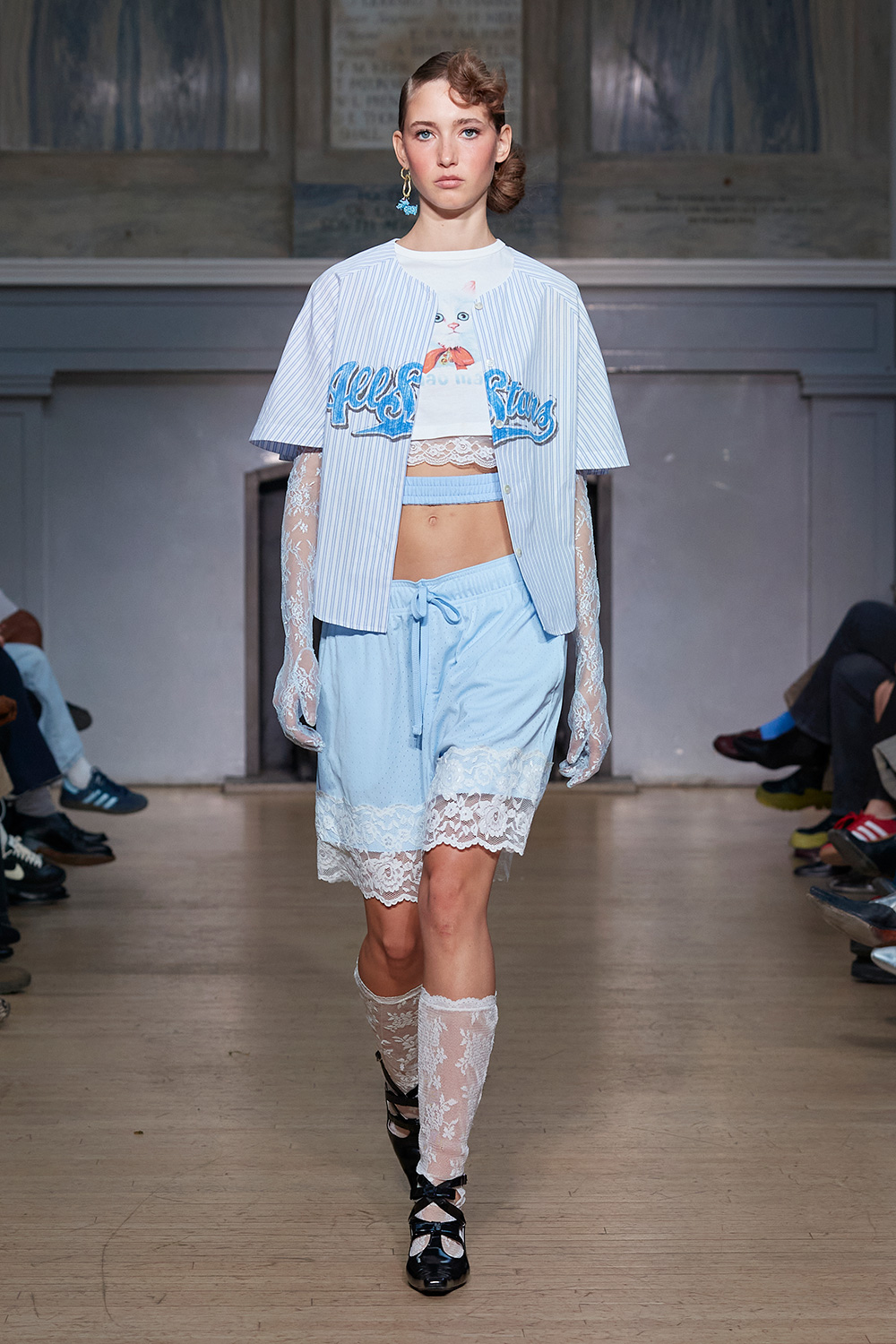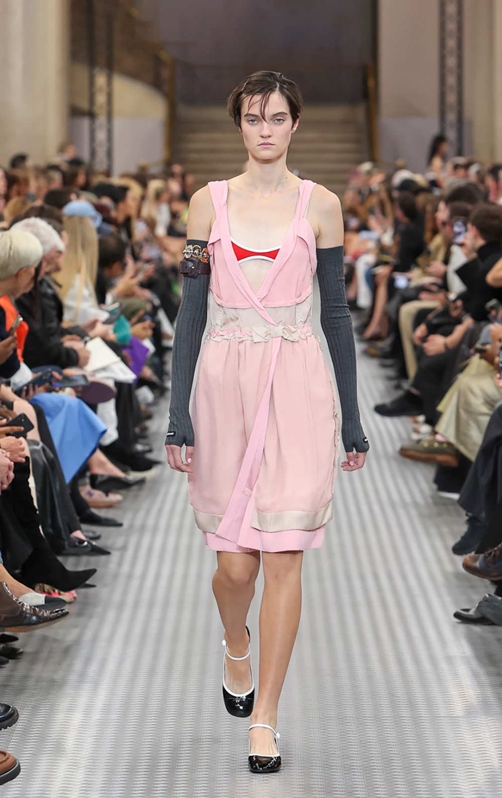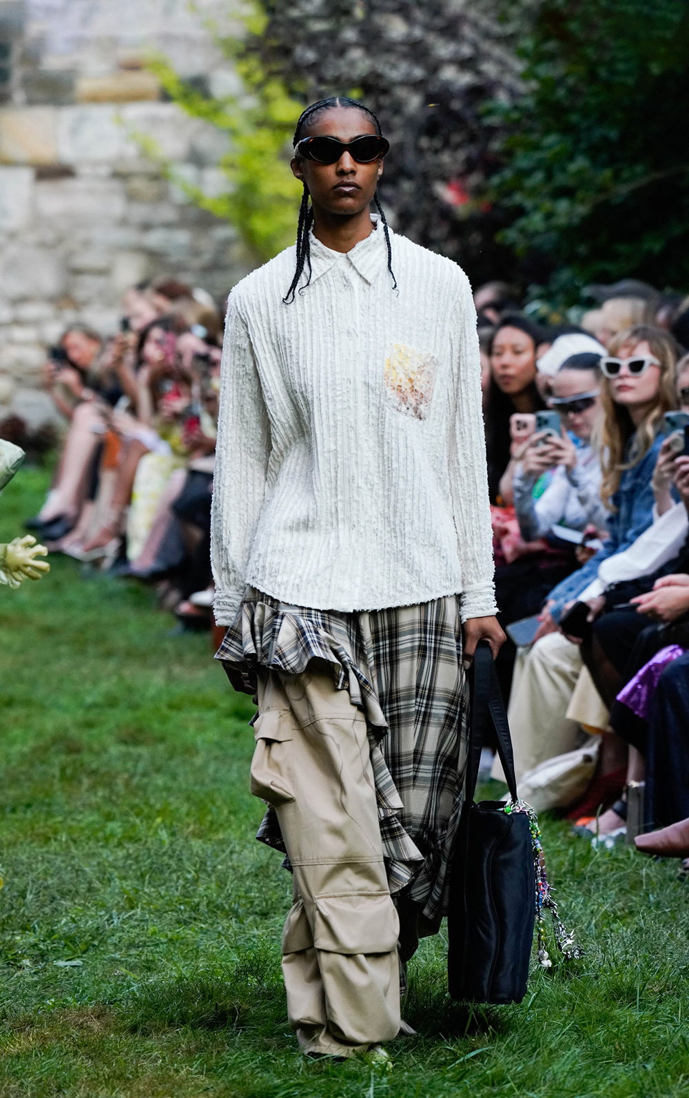 マスキュリン×フェミニンのみならず、異なるテイストの掛け合わせは定番化している。代表格は、今季も既成概念にとらわれないスタイリングが光った「ミュウミュウ(MIU MIU)」や、意表を突くミックス&マッチを連打した「プラダ(PRADA)」。「バーバリー(BURBERRY)」などが見せた、華やかなドレスにユーティリティーアウターを合わせる提案も象徴的だ。また、2000年代中盤から10年代初期に盛り上がり、今若者を中心に再燃しつつある「インディ・スリーズ」の影響を感じさせるような、1990年代のグランジをはじめとするビンテージ要素を取り入れた折衷スタイルにも注目。