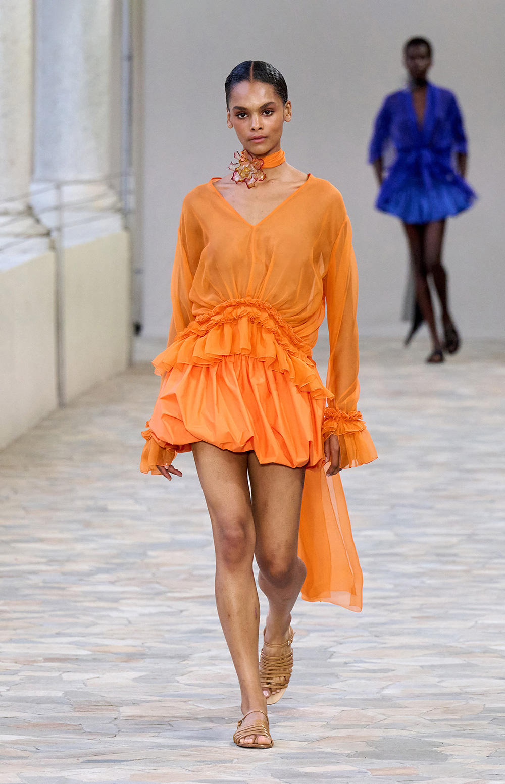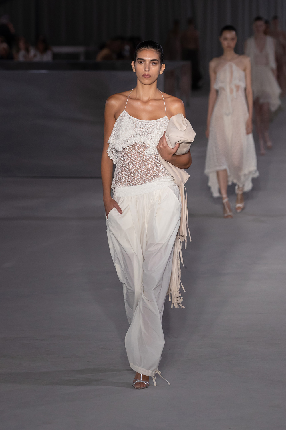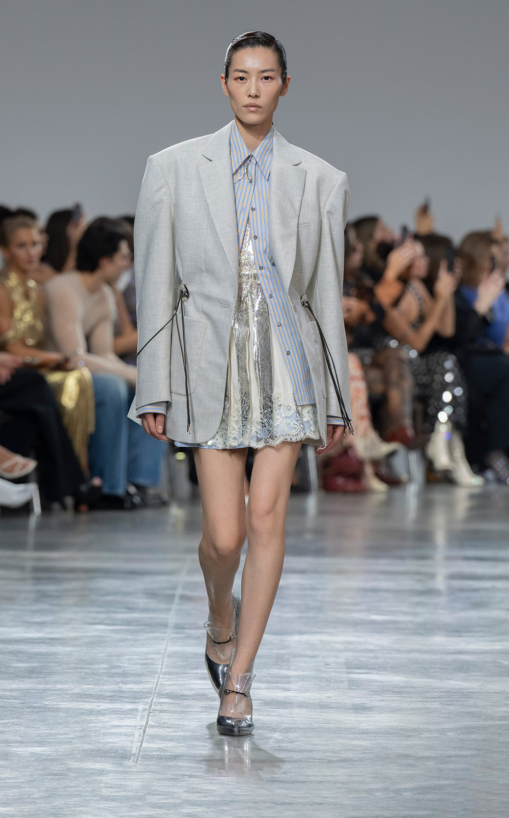 オーガンジーやレースなど透け感のある素材を生かした軽やかなスタイル提案は数年継続しているが、今季はさらに拡大。トップスやドレスからアウター、テーラリング、ボトムスにいたるまで、多様なデザインが見られた。中心となるのは、インナーにブラトップやショーツを合わせたレイヤードや、シアー素材同士を重ねて作るスタイル。「ロエベ(LOEWE)」のフープドレスのように、風にヒラヒラ揺れる裾も軽やかな印象につながる。特に猛暑が長く続く日本では、見た目と着心地の両軸で、いかに涼しさと軽やかさを表現するかがますます重要になるだろう。