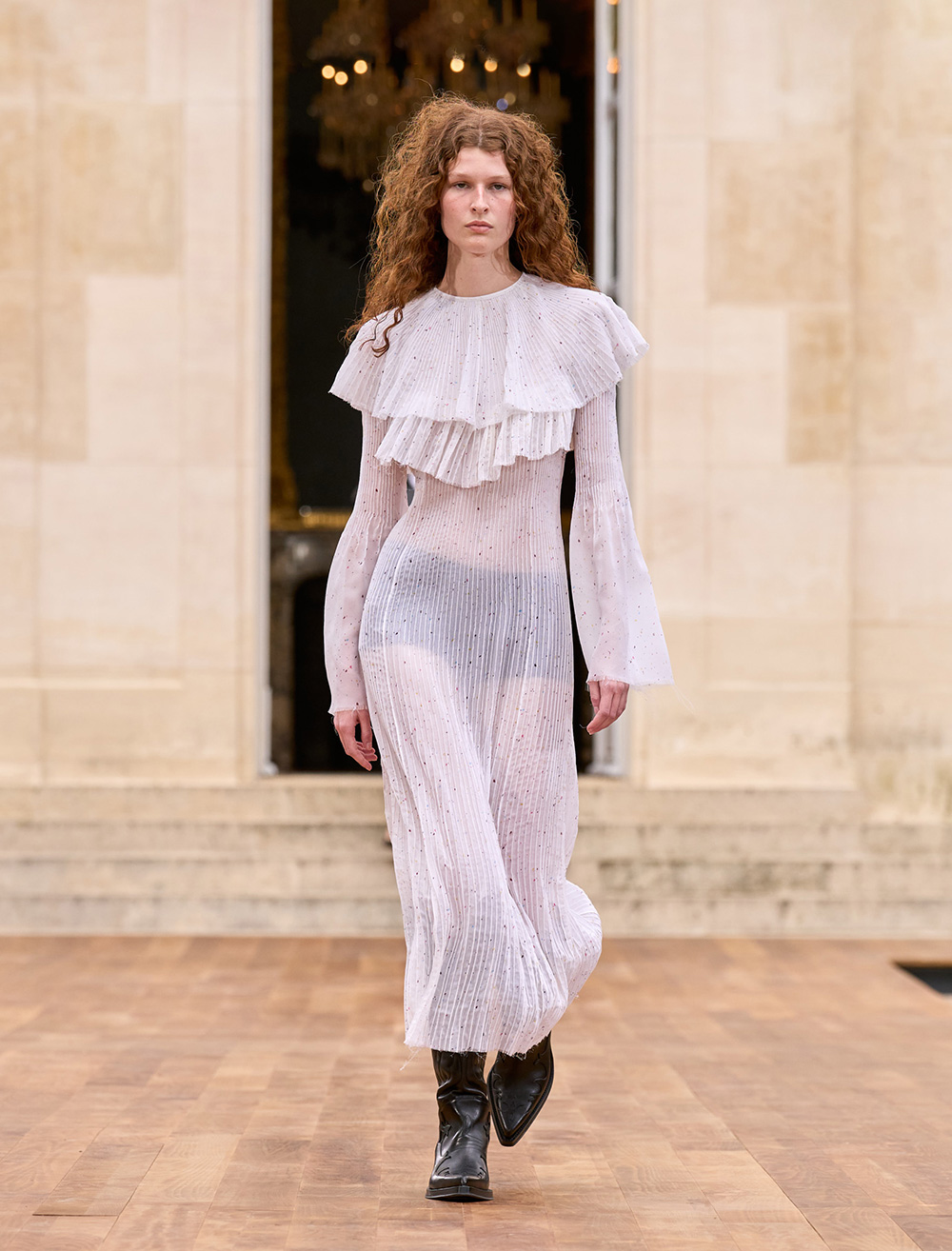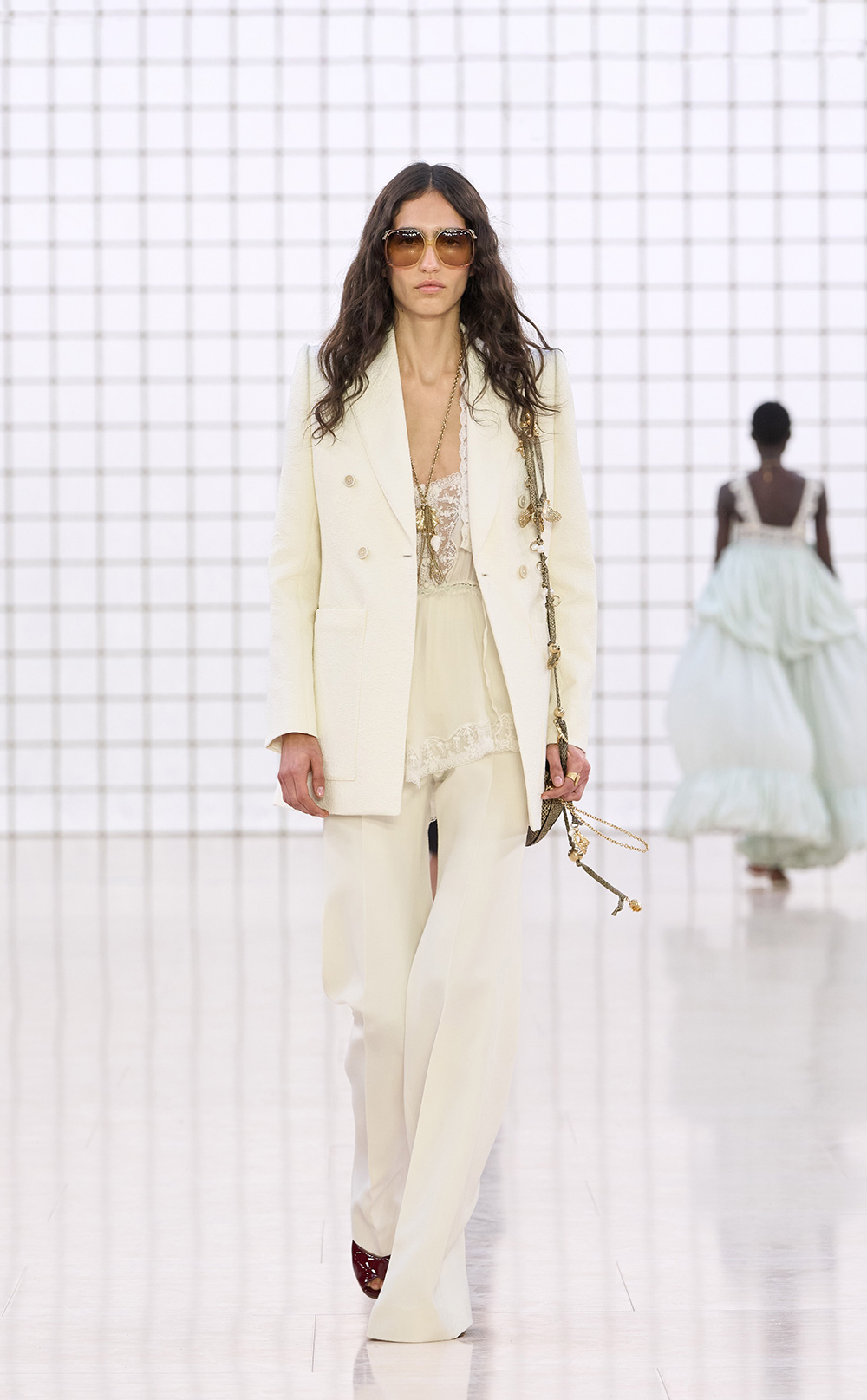 1970年代後半のアーカイブから着想を得た「クロエ(CHLOE)」を筆頭に、開放的なボーホーシックの系譜を感じさせるロマンチックなスタイルが勢いを増している。カギは、フリルやラッフル、ふんわりしたボリュームを生むギャザー、手仕事を感じる素朴なレースにクロシェ編み、ノスタルジックな花柄やペイズリー、フォークロア調のアクセサリー。ロマンチックというと甘い印象になりがちだが、「サンローラン(SAINT LAURENT)」や「ジマーマン(ZIMMERMANN)」のようにマスキュリンなアイテムや渋めな色使いでバランスをとれば、年齢を問わず楽しめる今季らしいスタイルに仕上がる。