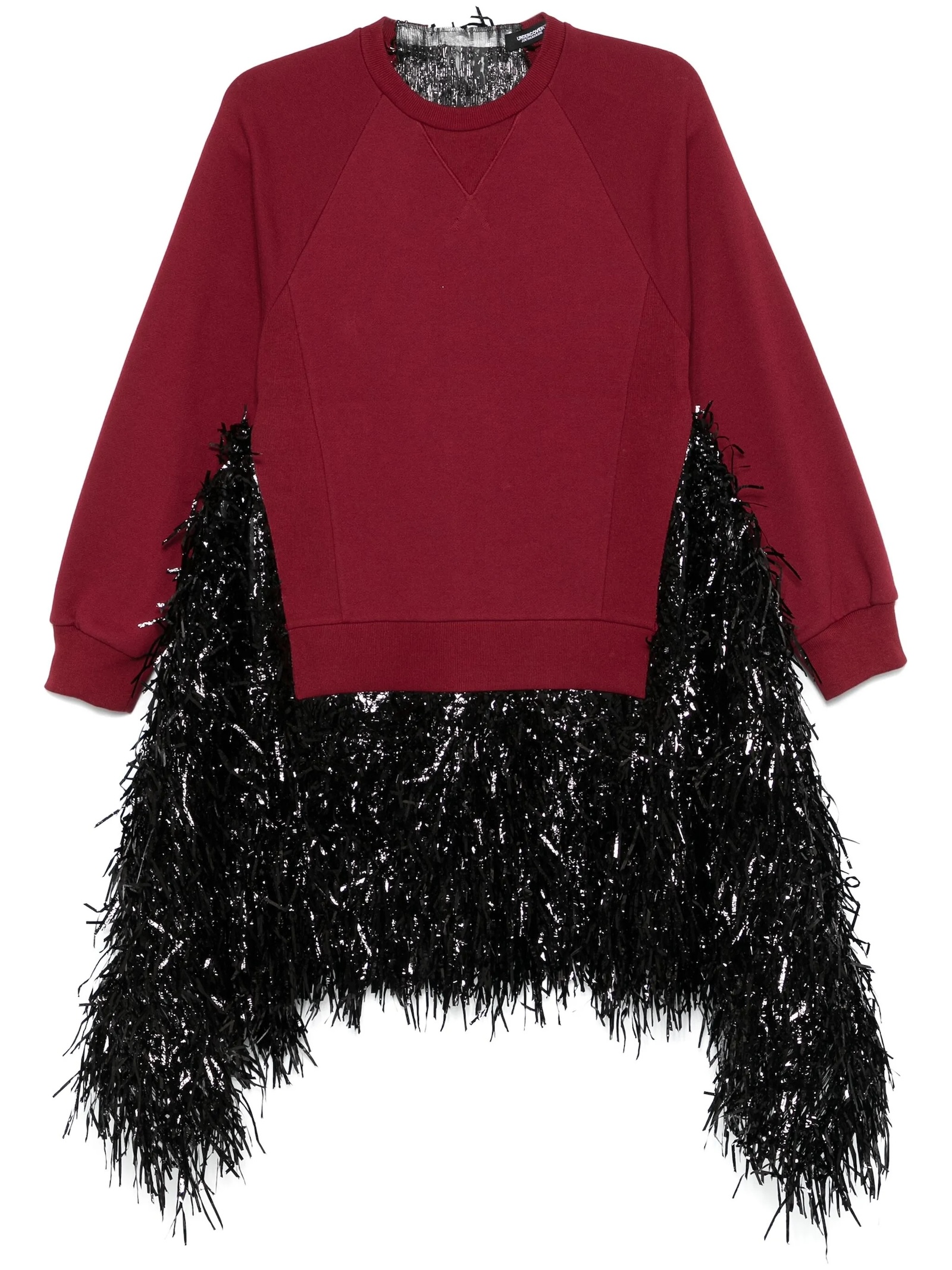 「アンダーカバー(UNDERCOVER)」は、定番プレッピーの白シャツにスエットを重ね着しました。大学生のような眼鏡とバッグに対し、ミニスカートはキラキラ&ふさふさのシャギー仕立て。裾もアシンメトリーで動きを加え、タイツでレッグラインをすっきり見せて、ボリュームの落差を際立たせました。