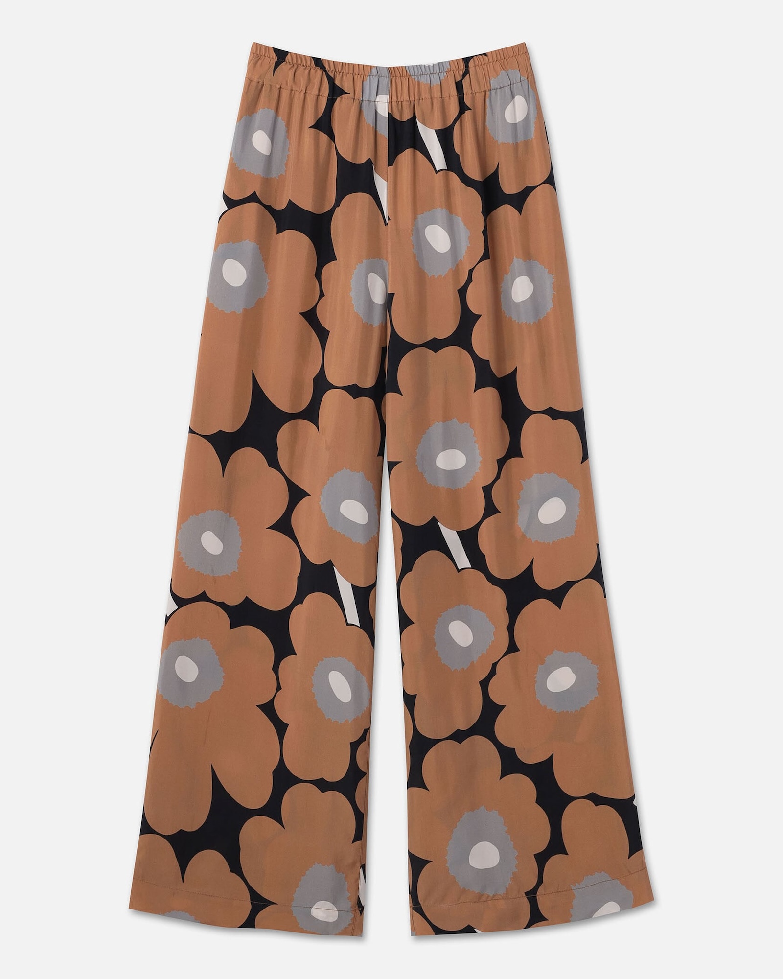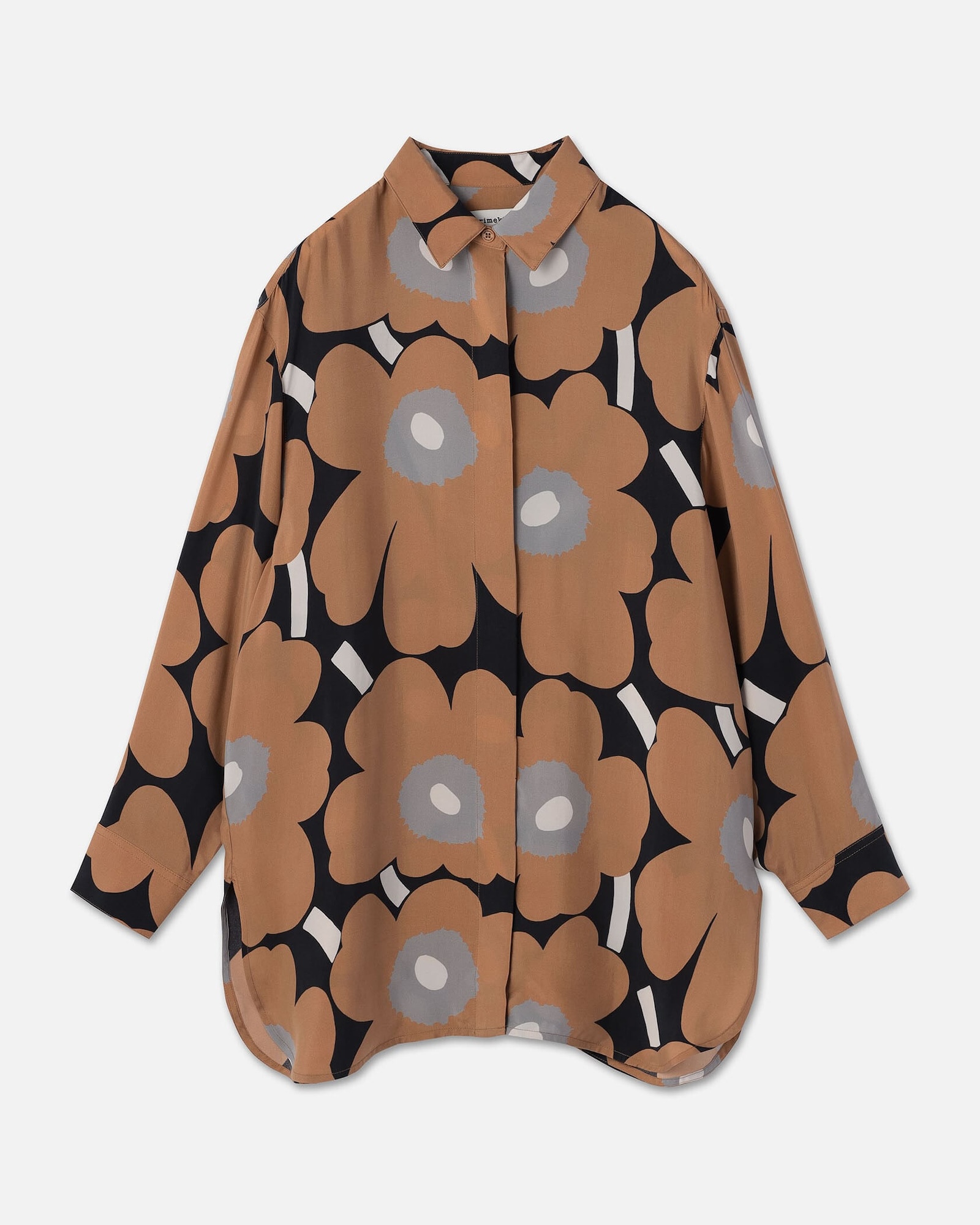 例えば、「マリメッコ(MARIMEKKO)」はシグネチャーモチーフのウニッコ柄をブラウンで彩りました。赤や黄色のイメージが強いウニッコ柄をブラウンにすることで、一気に落ち着いた大人のムードに。もともと癖が強くない色調なので、全身でまとってもくどくならず、むしろソフトでナチュラルな表情に映ります。今回は、さまざまなシチュエーションで好印象を与えてくれるブラウン系のコーディネート術を、国内外の2024-25年秋冬コレクションルックからご紹介します。