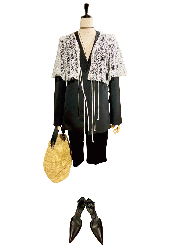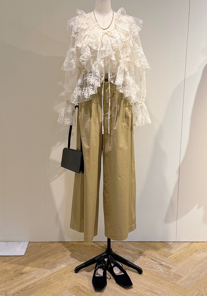 展示会場でも一番目を引いたのが、レースフリル盛り盛りのブラウスを主役にしたスタイリングだ。20代がターゲットのブランドならではの、思い切ったガーリー&ロマンチックな提案が光る。トップスに存在感がある分、きれいめのチノパンツ、控えめサイズのミニバッグとフラットパンプスを合わせ、やりすぎ感なくまとめた。