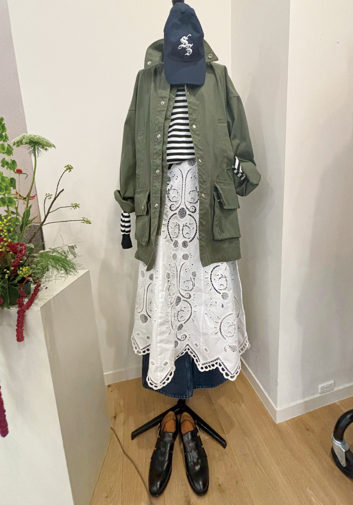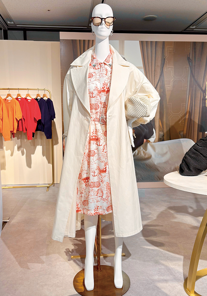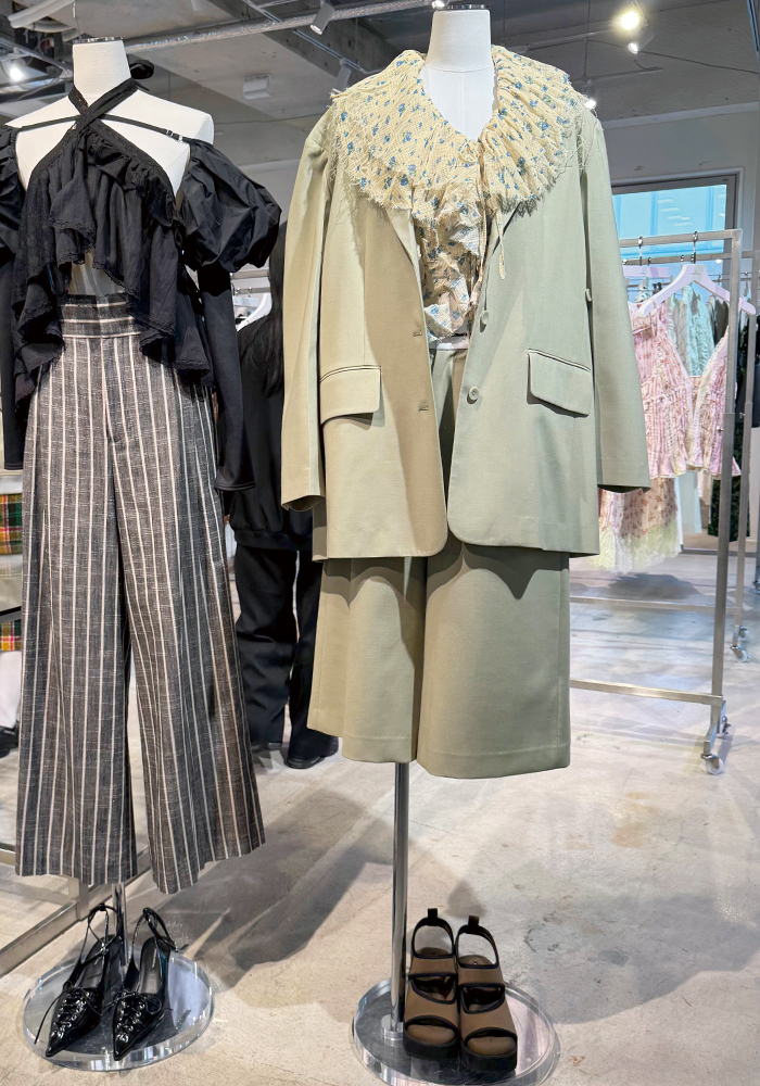 チュールやレースは毎シーズン人気のアイテム。「今季は“甘い”だけではない、ガーデンロマンチックムードを打ち出す」(渡邊倫子ディレクター)。推しスタイリングも小花柄ブラウスとテーラードのセットアップで、甘さとマニッシュさをうまく掛け合わせた。今季は真夏に着られるアイテムの幅を広げ、投入時期も実需ジャストに寄せる。