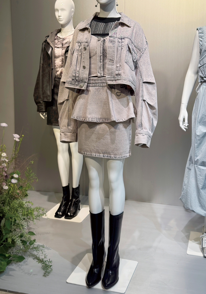 パステルカラーをモードに着こなす提案がユニーク。ミニ丈スカートやペプラムデザインのビスチェでトレンド要素を取り入れつつ、ブリーチ加工でエッジィに仕上げた。24年春夏はレザーやデニムなど「加工感が強めの素材が好評だった」(園部涼子PR)。引き続きこれらにシアー素材などを組み合わせてセンシュアルに提案する。