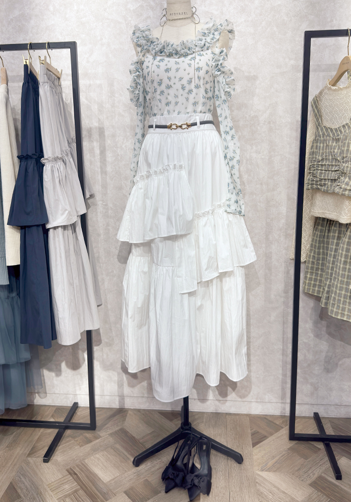 フレンチガーリーテイストで若い女性に支持を得るブランドらしく、フリルたっぷりの立体感のあるスカートで、トレンドのボヘミアン要素を取り入れた。MD全体としては重ね着アイテムを増やし、気温によって脱ぎ着できるコーデ提案を充実させる。来年3月にはブランド立ち上げ10周年に合わせ、1号店の渋谷109店をリニューアルする。