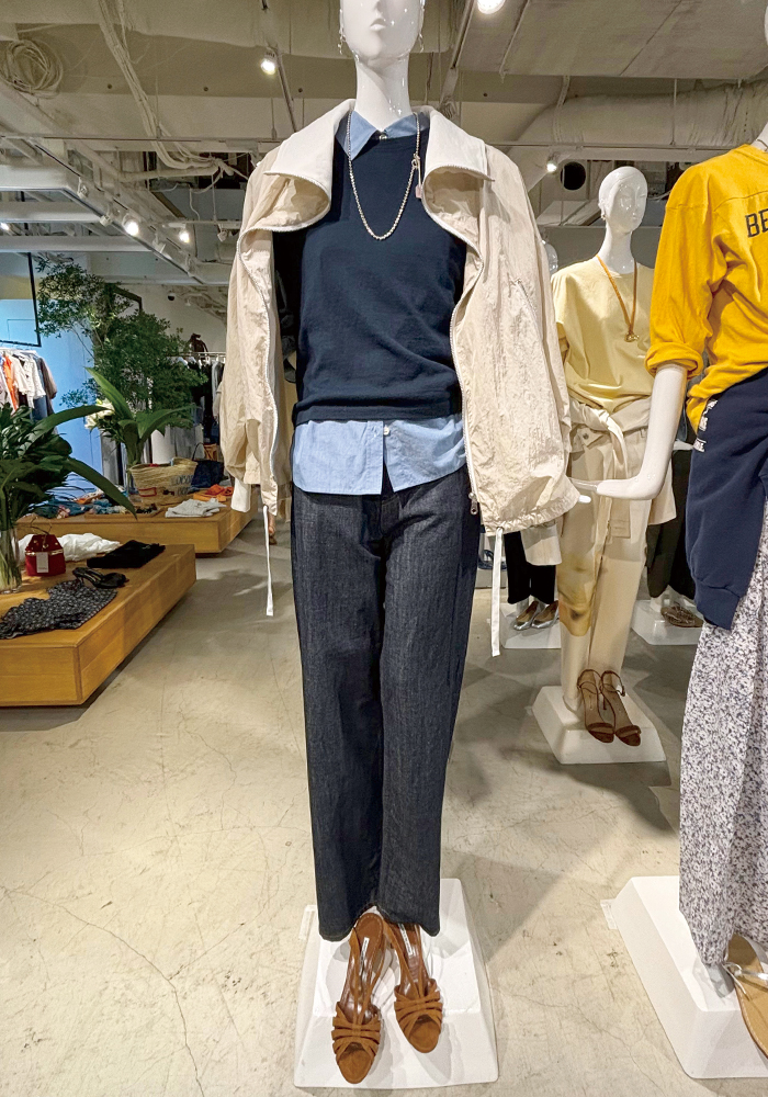 「ニューヨークに生きる女性が一カ月パリに滞在したら」というストーリーから企画した。定番アイテムにレースやマリンボーダーなどのパリジャンを想起させるアイテムを組み合わせて提案する。強みのデニムは、シンプルなシャツやカットソーと合わせても様になるシルエットの美しさを追求した。レースのワンピースとの重ねが今季らしい。