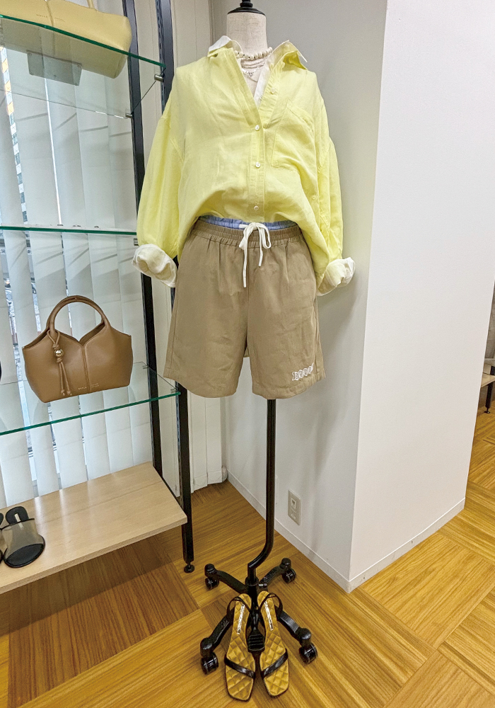 スポーティー&フォークロアをミックス。推しスタイリングは、膨らみのあるシルエットが目を引くペプラムトップスに、サイドラインの入ったスポーティーなショートパンツを合わせた。雑貨では、1万円台前半の単価を抑えたバッグの色展開を増やし、「“盛る”トレンドに合わせて、バッグチャームを強化してセット買いにつなげる」(吉野真由プレス)。
