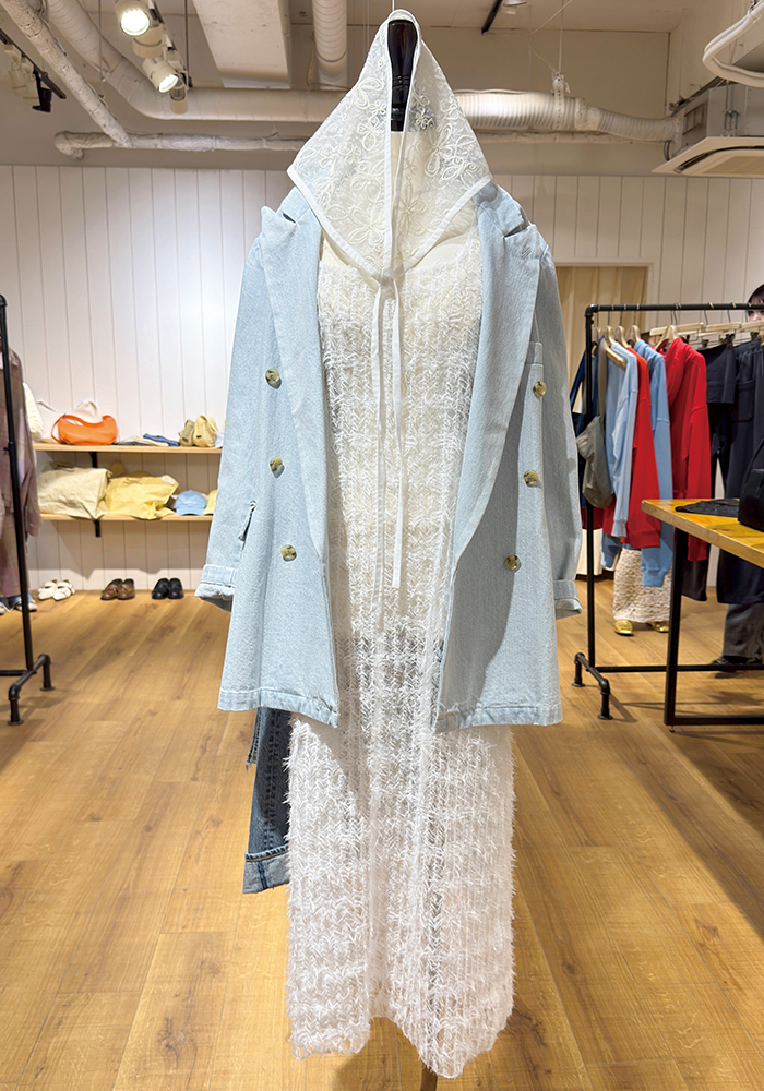 透け素材で全身を覆う大胆なコーデ。「ビスチェやボンネットキャップ、腰に巻くラップスカートなど、なくても済むが、あれば気分が上がる“プラスワン”のアイテムを強化する(西部結花クリエイティブディレクター)。ロマンチックなデザインのワンピースは、ブランドが得意とするデニムとの甘辛コーデで打ち出す。