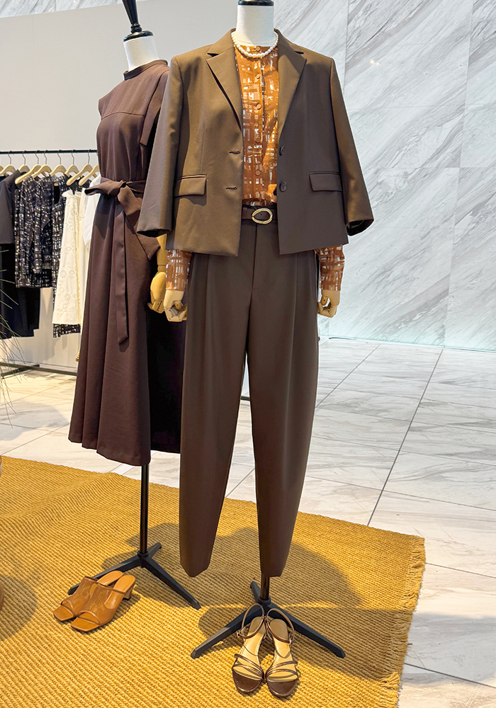 トレンドのブラウンのトーン&トーンでまとめたセットアップスタイルは、バレルパンツと7分袖のジャケットのモダンなバランスで、野暮ったく見せない。インナーの幾何学プリントのシアー素材カーディガンも抜け感をもたらしている。大人女性が華やかに着飾る提案として、ボリュームスリーブやリボンシャツやブラウスなどを取り入れる。