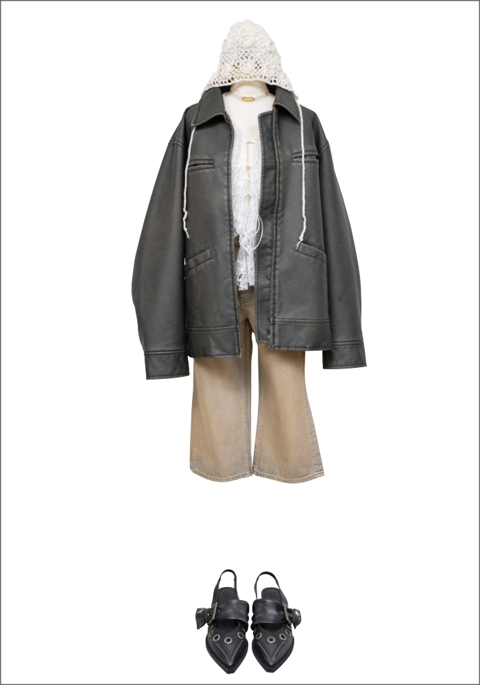 グランジテイストに女性らしいアイテムをプラスするのが今シーズンのテーマ。ビンテージ加工のフェイクレザージャケットを主役に、全面レースのフリルトップス、足元にポインテッドトゥミュール、立体的なクロシェ編みニット帽と、小物も駆使してバランスをとった。ランウエイでも見られたサブリナパンツも取り入れ、他ブランドと差別化する。