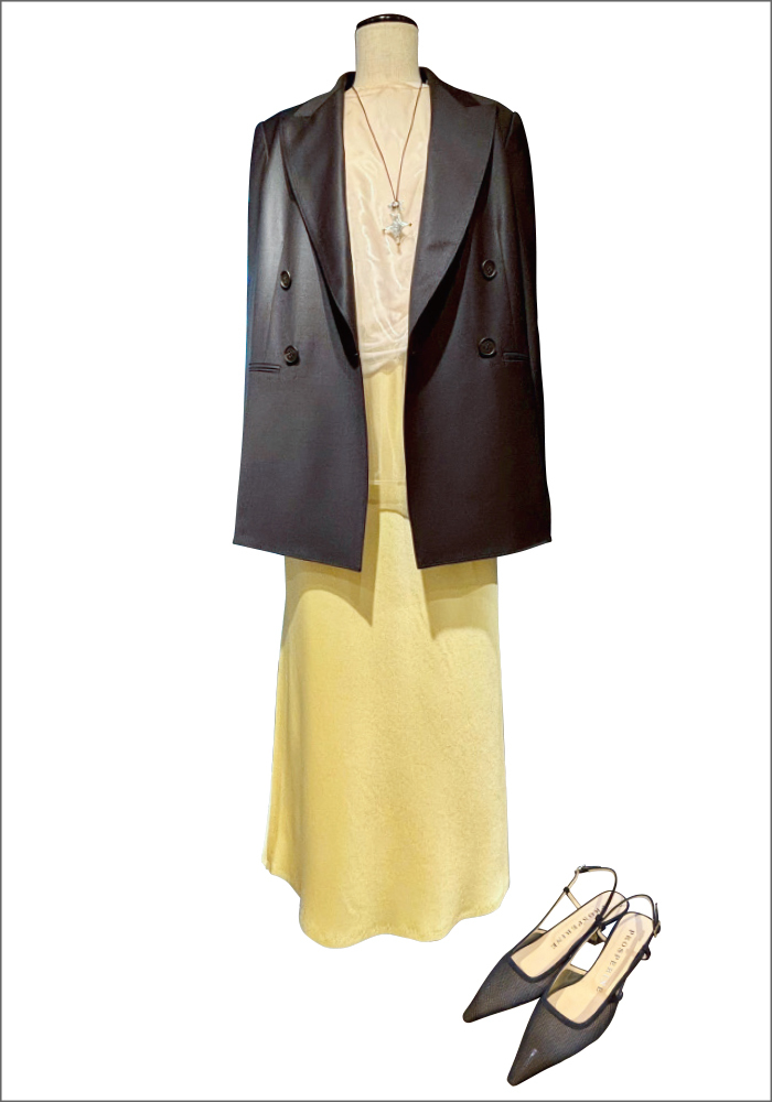 アイテム自体はベーシックだが、シアー素材をふんだんに取り入れる。MA-1は中綿入りで、春先の肌寒い日にも活躍する。中に着たリボンブラウスはミントとカーキの2色使いで奥行きがある見た目に。ボトムスには甘すぎないウオッシュドジーンズ、パンプスはメタリック素材をチョイスした。「継続トレンドのシアー素材は鮮度がポイント」(山本周平MD)。