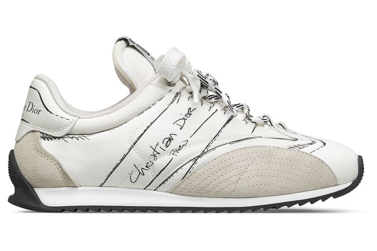 “D-スケッチ”はレトロなシルエットとスレンダーなツートーンソールが特徴。“ワーク イン プログレス”をテーマに、デザインする際に描かれた鉛筆のスケッチを手作業で再現し、プロトタイプのように仕上げた。プリントナイロンの2色をラインアップし、ホワイトにはシルバー、ブラックにはゴールドのメタリックなクリンクルレザーを用いた。ダブルレース仕様とサイドに配した"Christian Dior" のブランドネームがアクセントになっている。