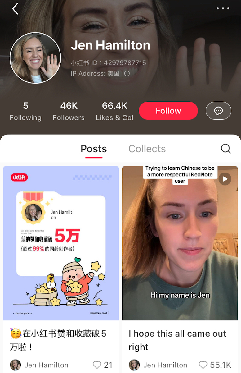 アプリ内の基本言語は中国語にもかかわらず、AI翻訳や中国語話者の力を借りながら、小紅書を楽しむ米国ユーザーが急増している。1月14日時点で、米国のiPhoneとAndroid使用者向けのアプリストアで最もダウンロードされた無料アプリとしてランクイン。TikTokの親会社バイトダンスが所有する「レモン8」を上回った。米国政府の中国政府に対する懸念に逆行するように、国民が別の中国発SNSに移行しているのは政府に対する抗議活動なのかもしれない。TikTokで390万フォロワーを持つ人気インフルエンサーのジェン・ハミルトン(Jen Hamilton)は、13日に小紅書で新たなアカウントを開設するとすぐに2万2000のフォロワーを獲得した(※1月15日時点で4万6000フォロワー)。「中国政府が私の情報を持っていようがいまいが、私は全く気にしていない」と話す。