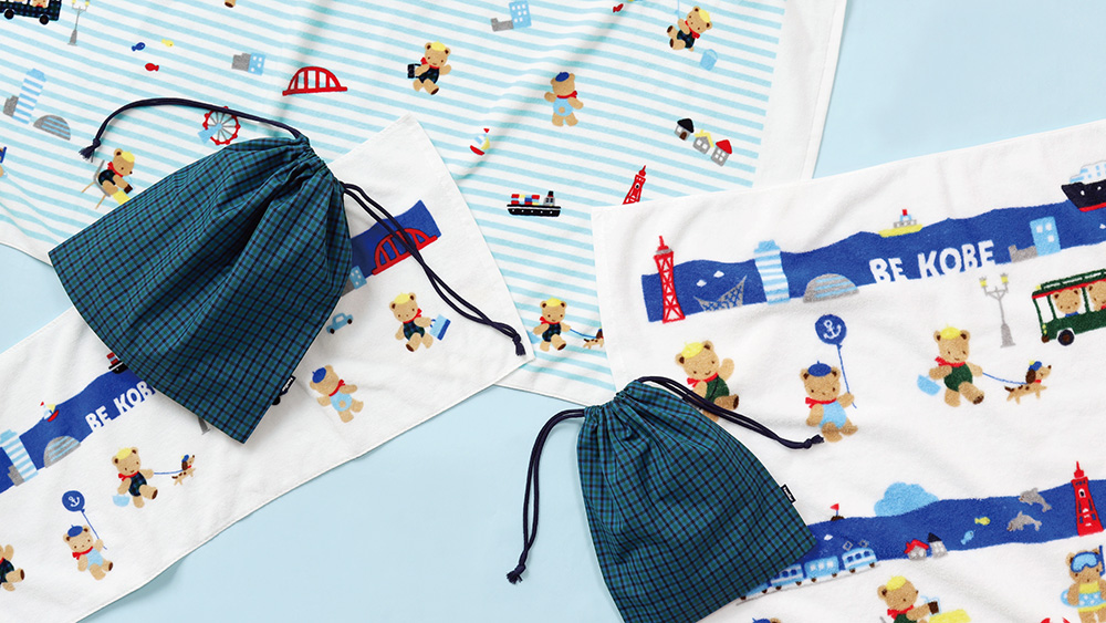 ファミリアは、子育て支援に力を入れる兵庫県神戸市の思いに共感し2022年から同市のふるさと納税返礼品の限定アイテムを企画する。販売中の最新アイテムは、タオルケットと、フェイスタオルとバスタオルのセットで、ライトブルーのボーダーや港のアートを取り入れ、神戸の街をファミリアならではのデザインで表現した。