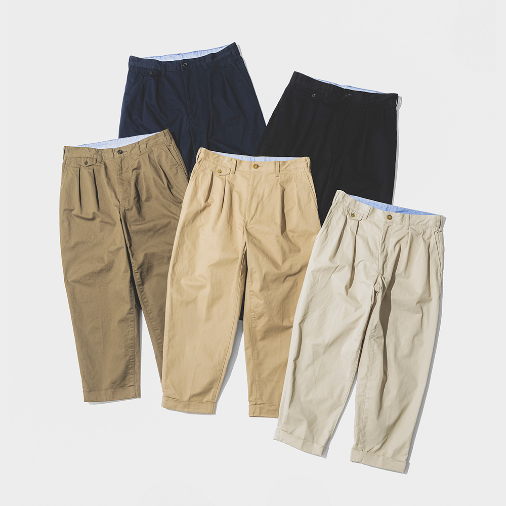 ロングセラーのワイドチノパンツは、北海道札幌市の縫製工場アナグラム・サッポロで製造する。ルーズすぎない上品な雰囲気とリラックス感、どんなトップスでも合わせやすいデザインがこだわり。腰回りにゆとりを持たせた2プリーツでクラシックな印象のウオッチポケット、やや短めの丈と、裾を折り上げたターンアップ仕様が特徴。