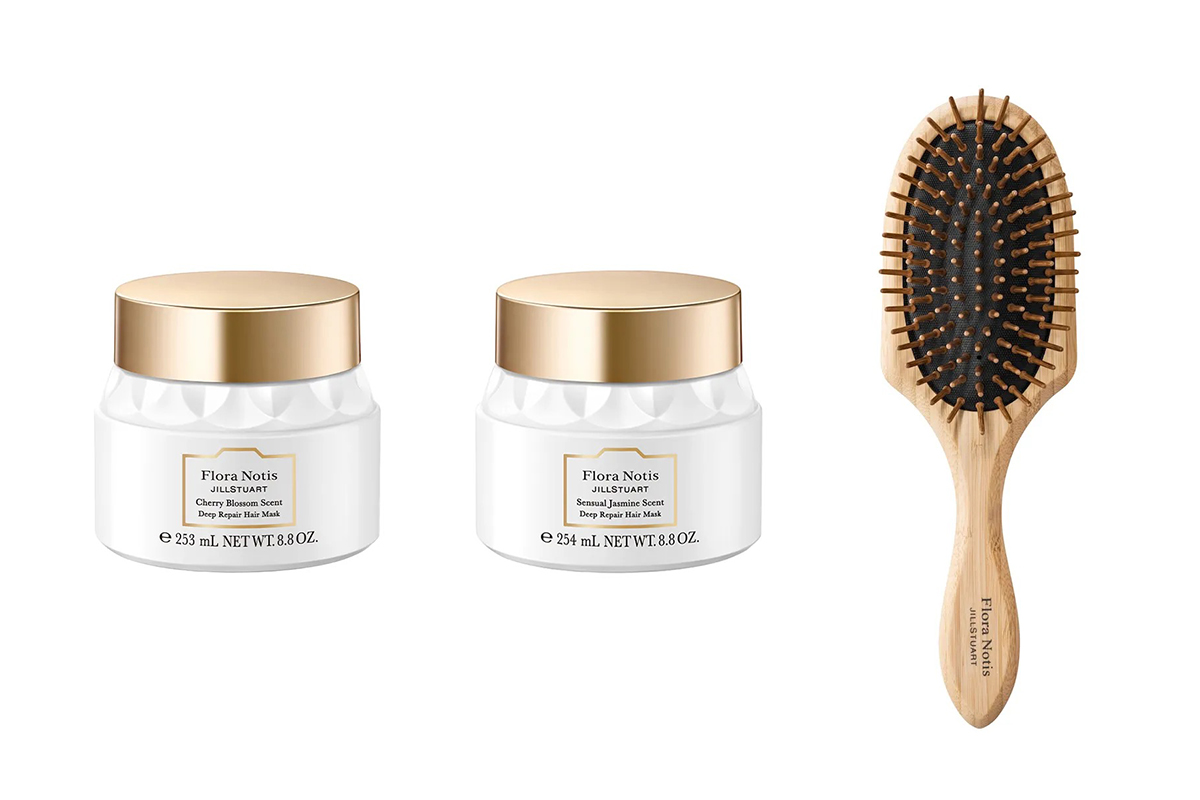 「フローラノーティス ジルスチュアート(FLORA NOTIS JILL STUART)」は、髪のゆがみに集中アプローチする“ディープリペアヘアマスク”とカッサ着想の“リラクシングパドルブラシ”を用意する。