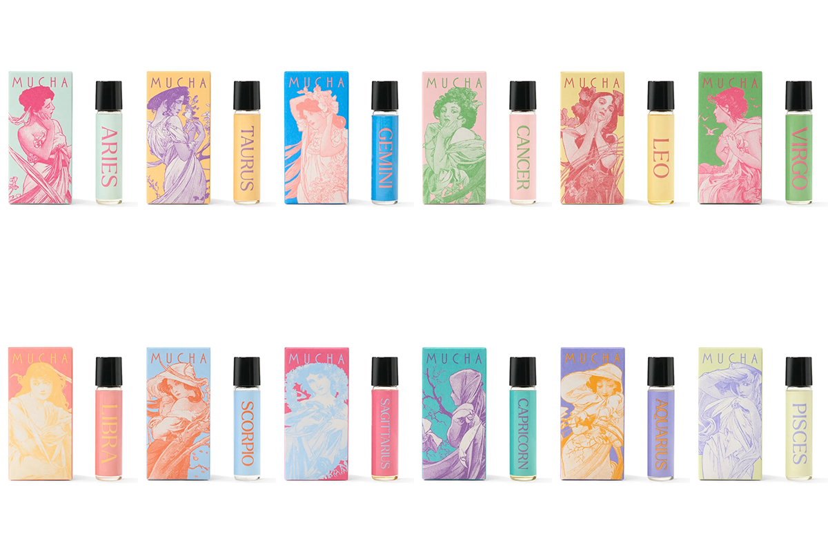 「ミュシャ(MUCHA)」は、ブランド初となるフレグランスオイル“ゾディアックサイン フレグランスオイル”を“12か月”の絵葉書をモチーフに、それぞれの星座に合わせて色鮮やかに仕上げたモダンなボックスに詰め込んだ。