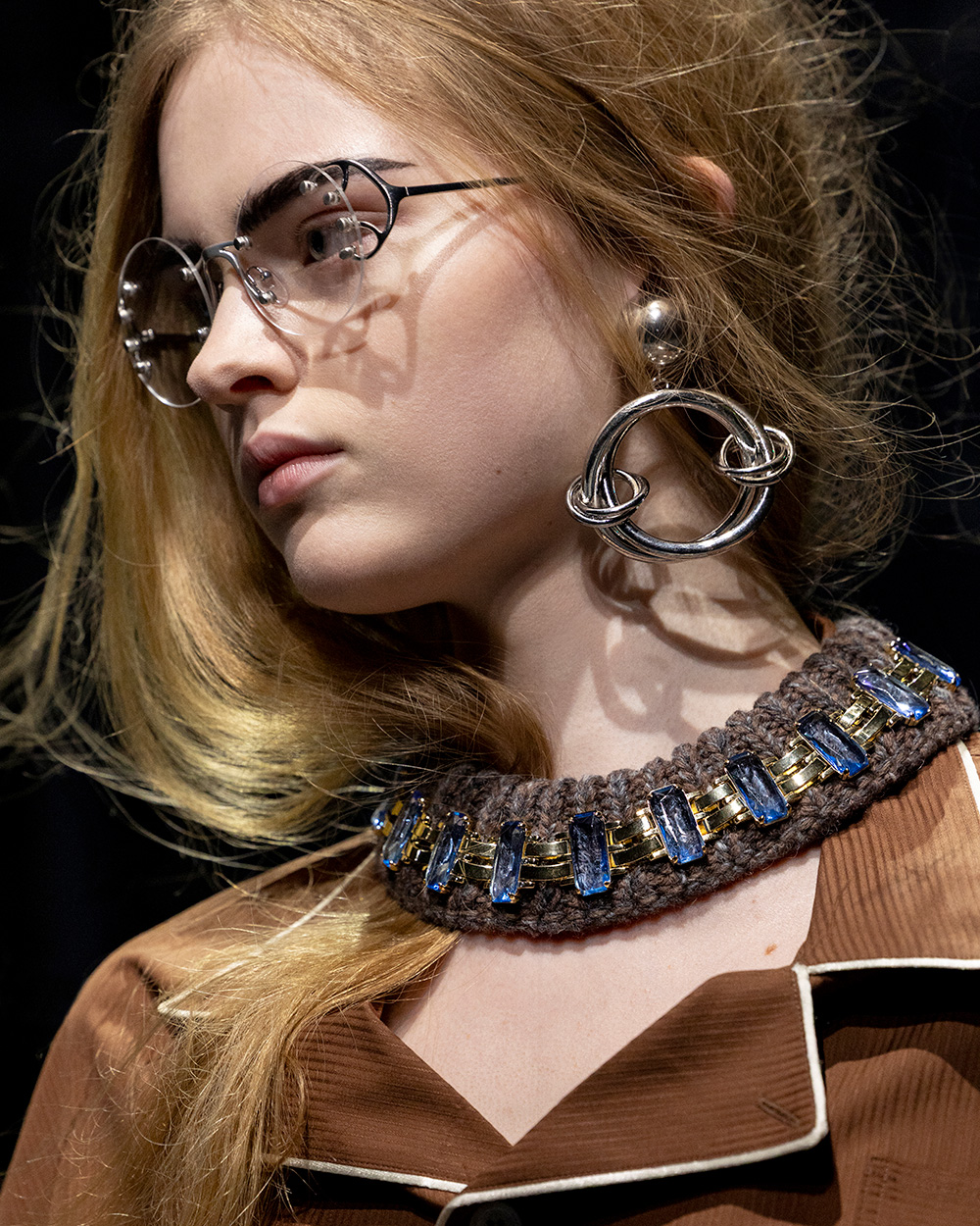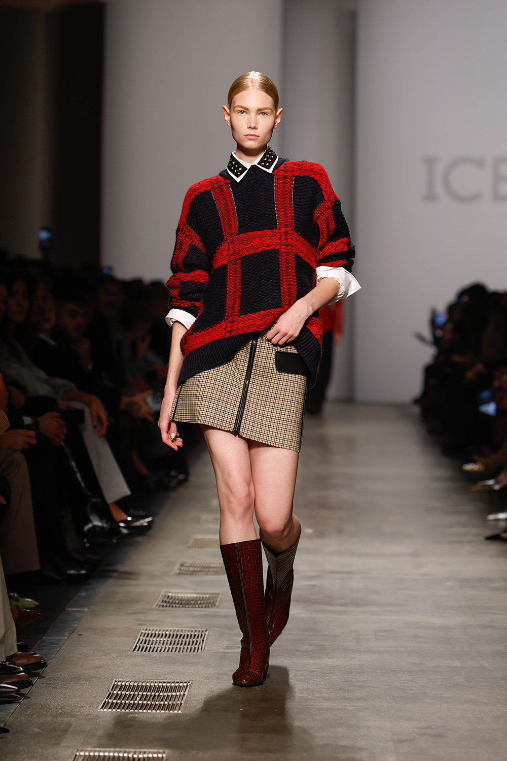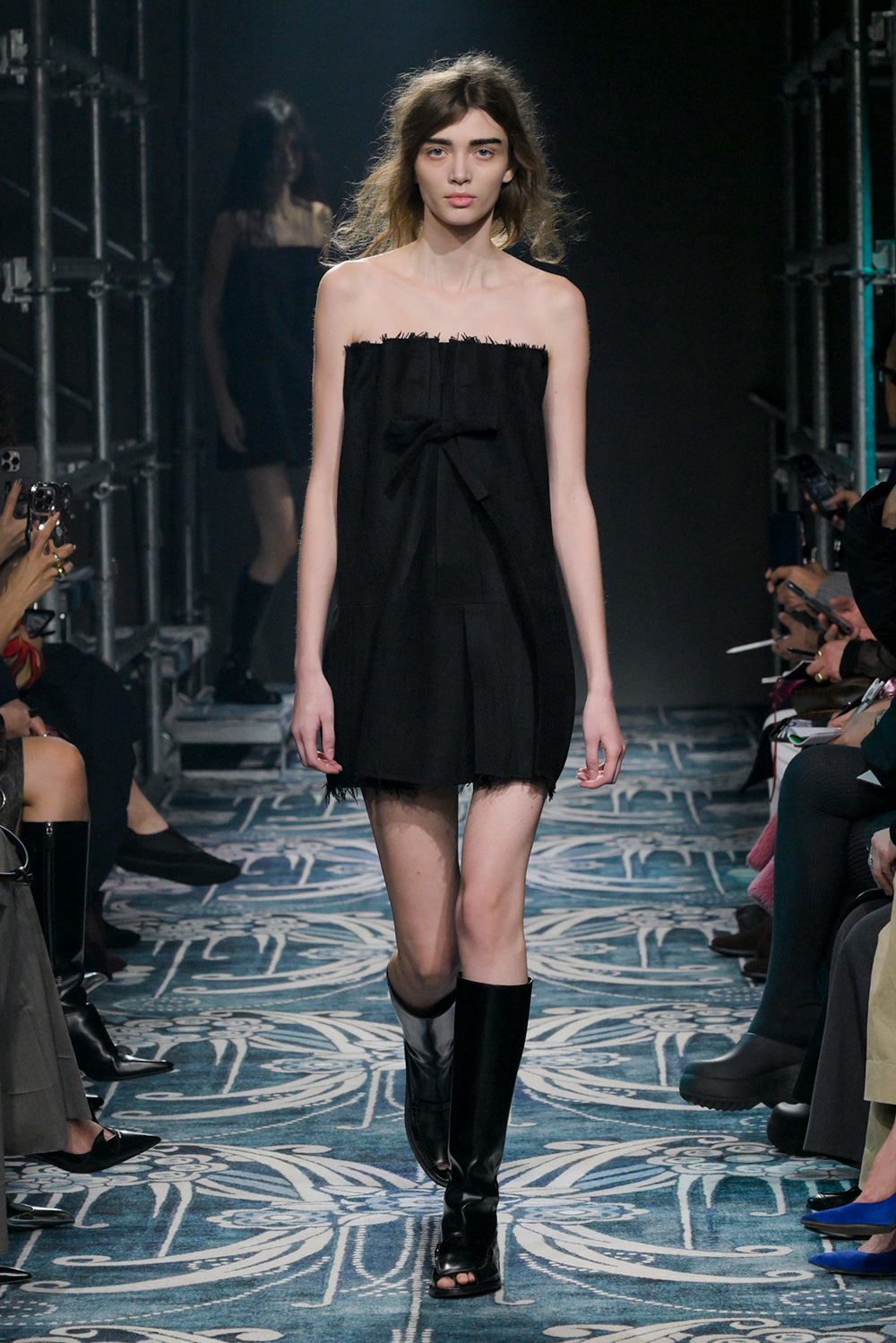グレートーンを基調にしたツイード風のジャケットやミニマルなロングコートといった、シックなフォーマルウエアが主流。千鳥格子のジャカードは、ところどころほつれたように糸が飛び出し、ボトムスはマイクロミニスカートやウォッシュ加工を施したジーンズを合わせてフォーマルを壊す。ボディーコンシャスなシルエットは従来より控えめで、新たにローライズを提案。腰の下にベルトループを配したスーパーローライズも登場し、存在感を放った。