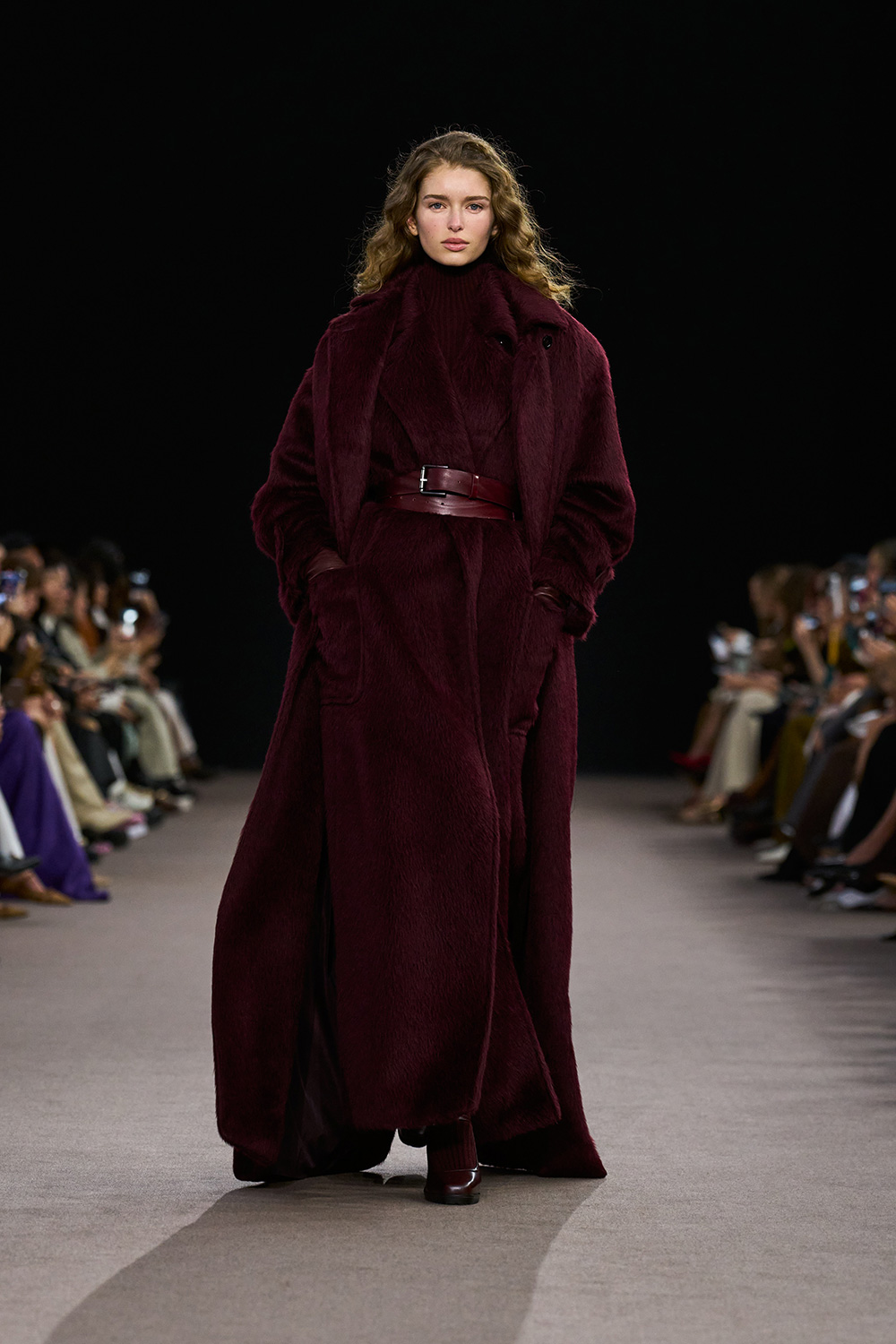英国のロマン主義作家、シャーロット・ブロンテ(Charlotte Bronte)の「ジェーン・エア」とエミリー・ブロンテ(Emily Jane Bronte)の「嵐が丘」から着想を得た。ブロンテ姉妹が暮らしていたヨークシャーの荒野を思い描き、キルティングのライニングやフロックコート、膝にプリーツを施した乗馬パンツのようなタフな印象のアイテムが登場。印象的なボルドーが女性の情熱を映し出す。一方で、コレクションの主役となった起毛感のある柔らかな素材で作るマキシ丈のコートやスカートの優雅な布使いが優しさを加えた。