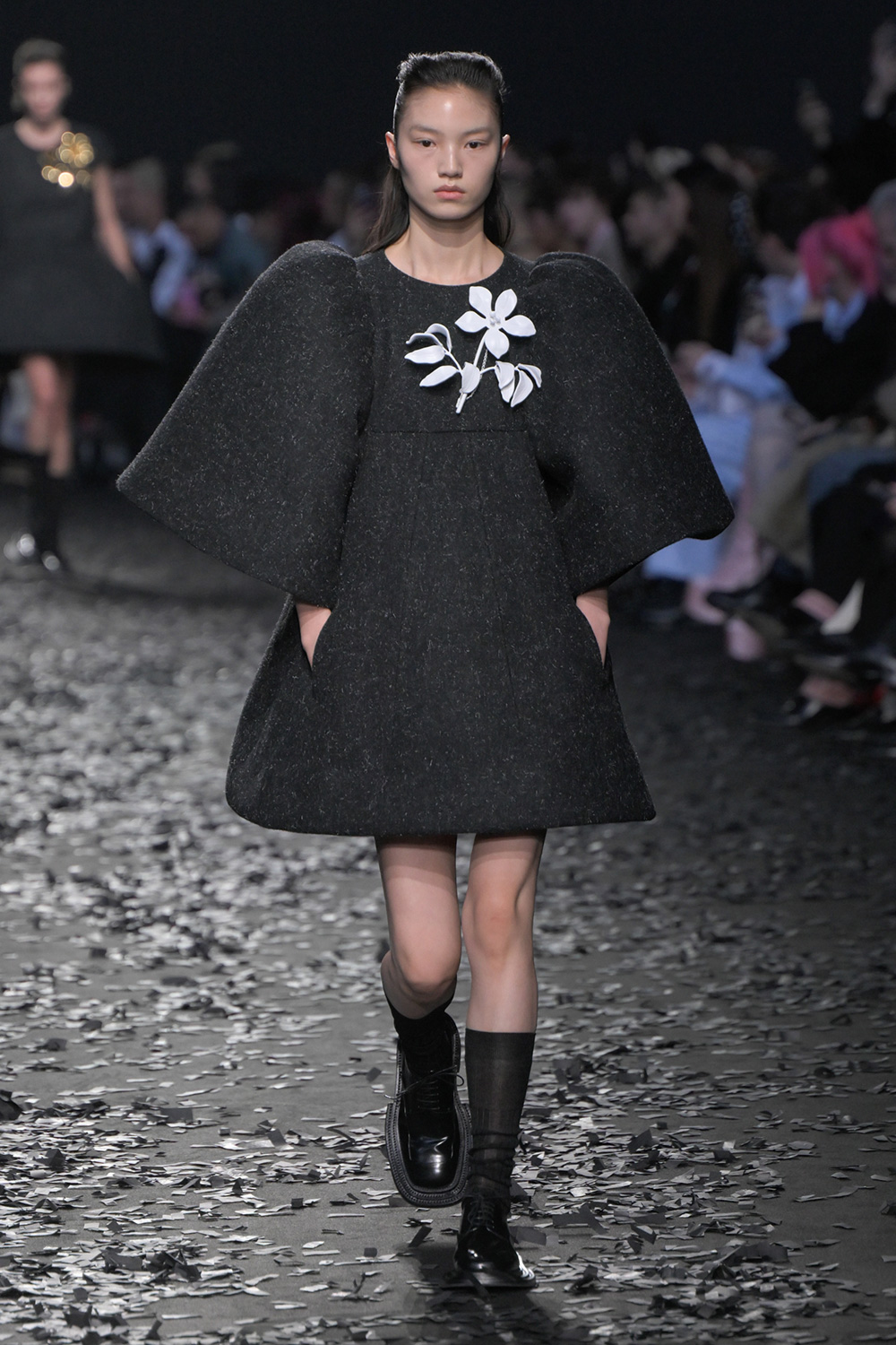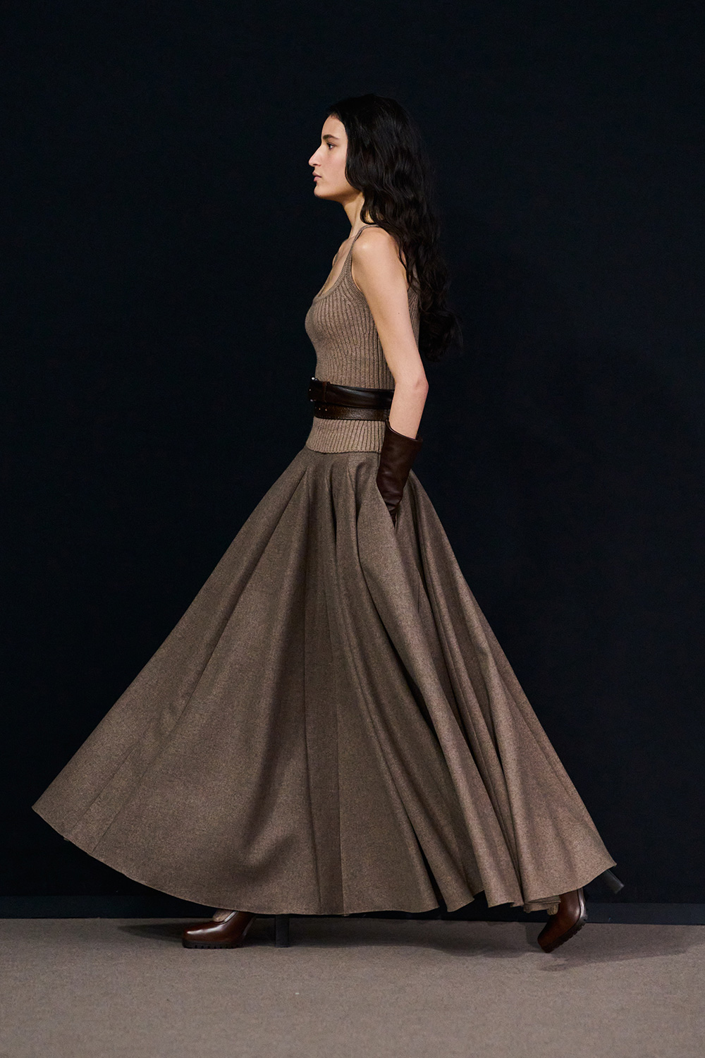 縮絨した硬質なブリティッシュウールで表現するのは、“女性らしさ”を象徴するアイテムであるミニドレス。素材の硬さゆえ、体のラインは拾わず、ネックラインには、“ソバージュ・フィニッシュ”と呼ぶ、切りっぱなしのディテールを加え、あえて粗野なニュアンスに落とし込んでいる。メンズのスーツパンツを切って作ったようなスカートも登場。根底にあるのは、「現代における女性らしさとは何か?」という問いだ。