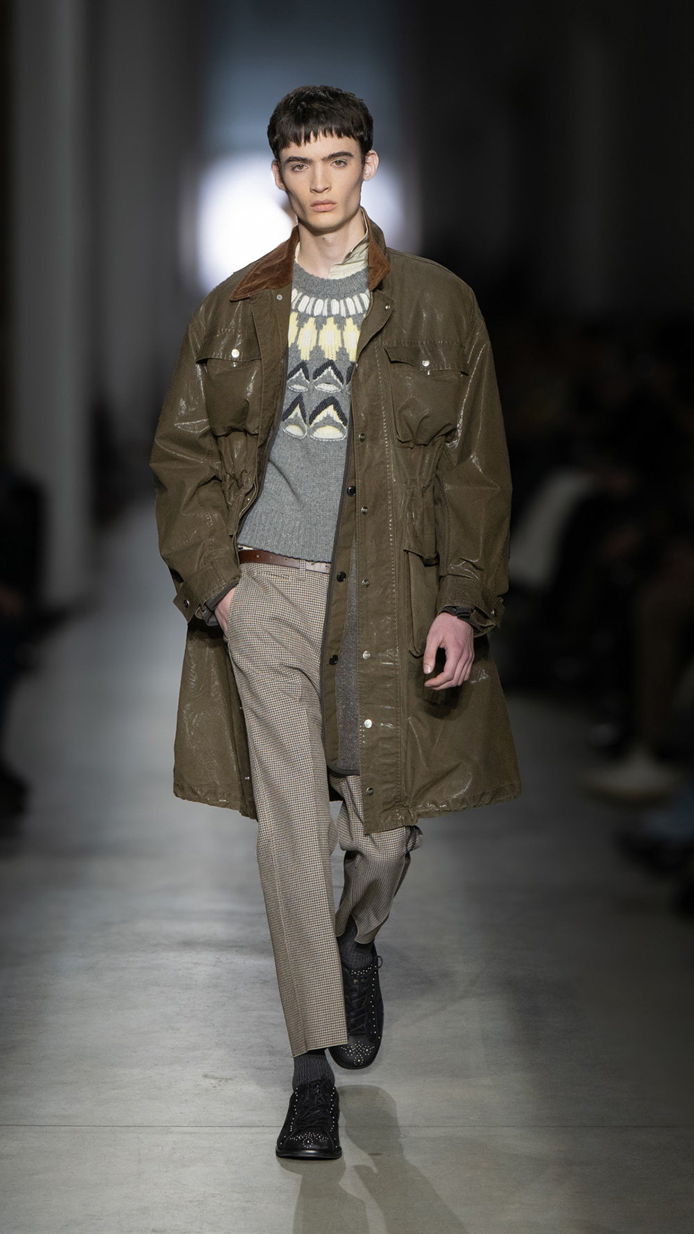 「アーバンデュアリティー」をテーマに、伝統と現代が交わる東京の二面性に着想を得た。メンズはタイトなPコートやチェック柄のスーツといった英国トラッドがベース。ウィメンズは淡いカラーのシフォンドレスやスパンコール刺しゅうブルゾンなど、引き続きロマンチックなスタイルを押す。男女共通してジップアップジャケケットやフィールドジャケットなどアウトドアアウターを組み合わせて、「二面性」を表現した。