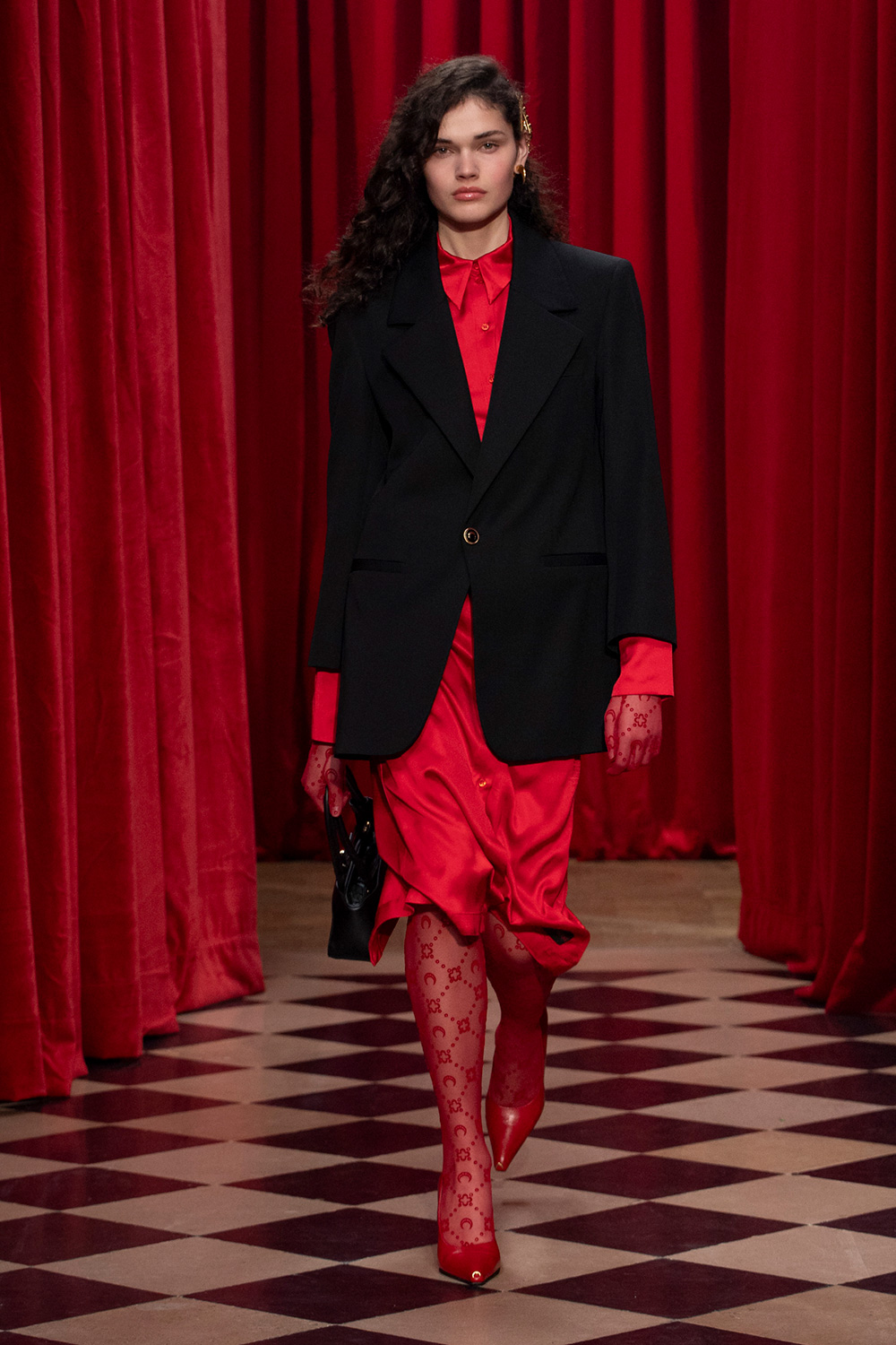 モダンなオフィスを舞台に、仕事もプライベートも全力で楽しむ“レディーボス”のようなビジネスウーマンの姿を描いた。スーツやコートなどのテーラリングからチャンキーなニットやミニドレスまで、デザインを特徴づけるのは1980年代をほうふつとさせる大胆なパワーショルダー。そこにレースやドレープ、ブラカップ、絞ったウエストで官能性とフェミニニティーを加えている。エキゾチックスキンに代わる素材やスネークプリントも多用。