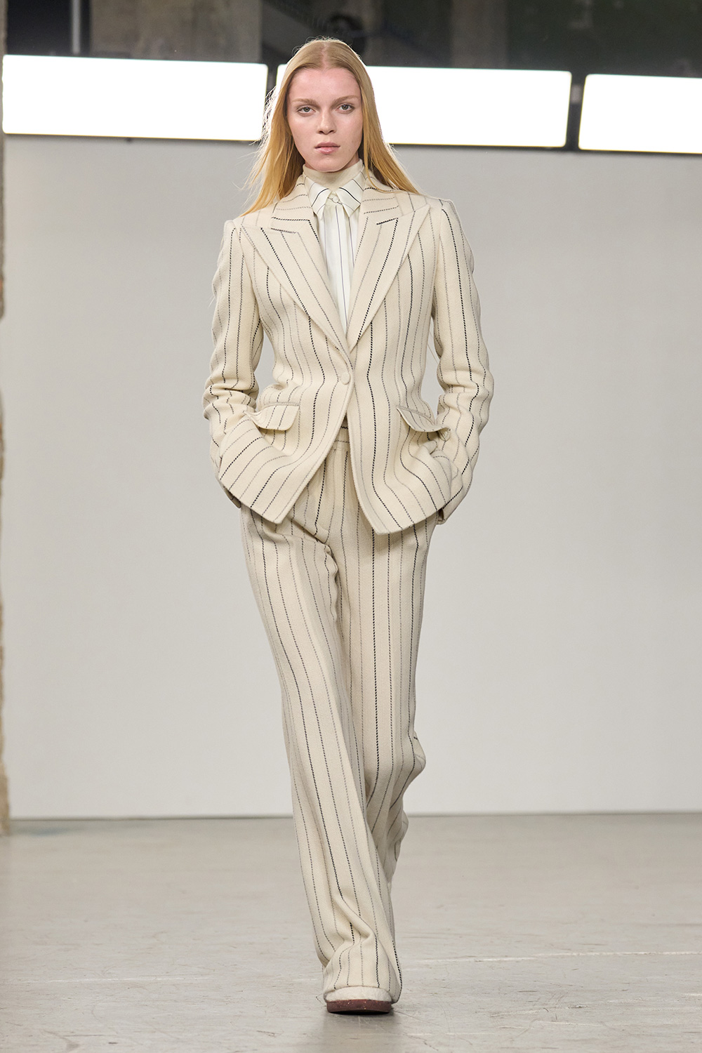 強さの表現の一つとして、自立したワーキングウーマンを描くコーポレート・シックなスタイルも多出した。象徴的なのは、「ステラ マッカートニー(STELLA McCARTNEY)」などが提案した1980年代を想起させるパワーショルダーのテーラリング。ペンシルスカートや絞ったウエストで、マスキュリンとフェミニンの対比を表現するアプローチも引き続き多い。(この記事は「WWDJAPAN」2025年3月24日号からの抜粋です)