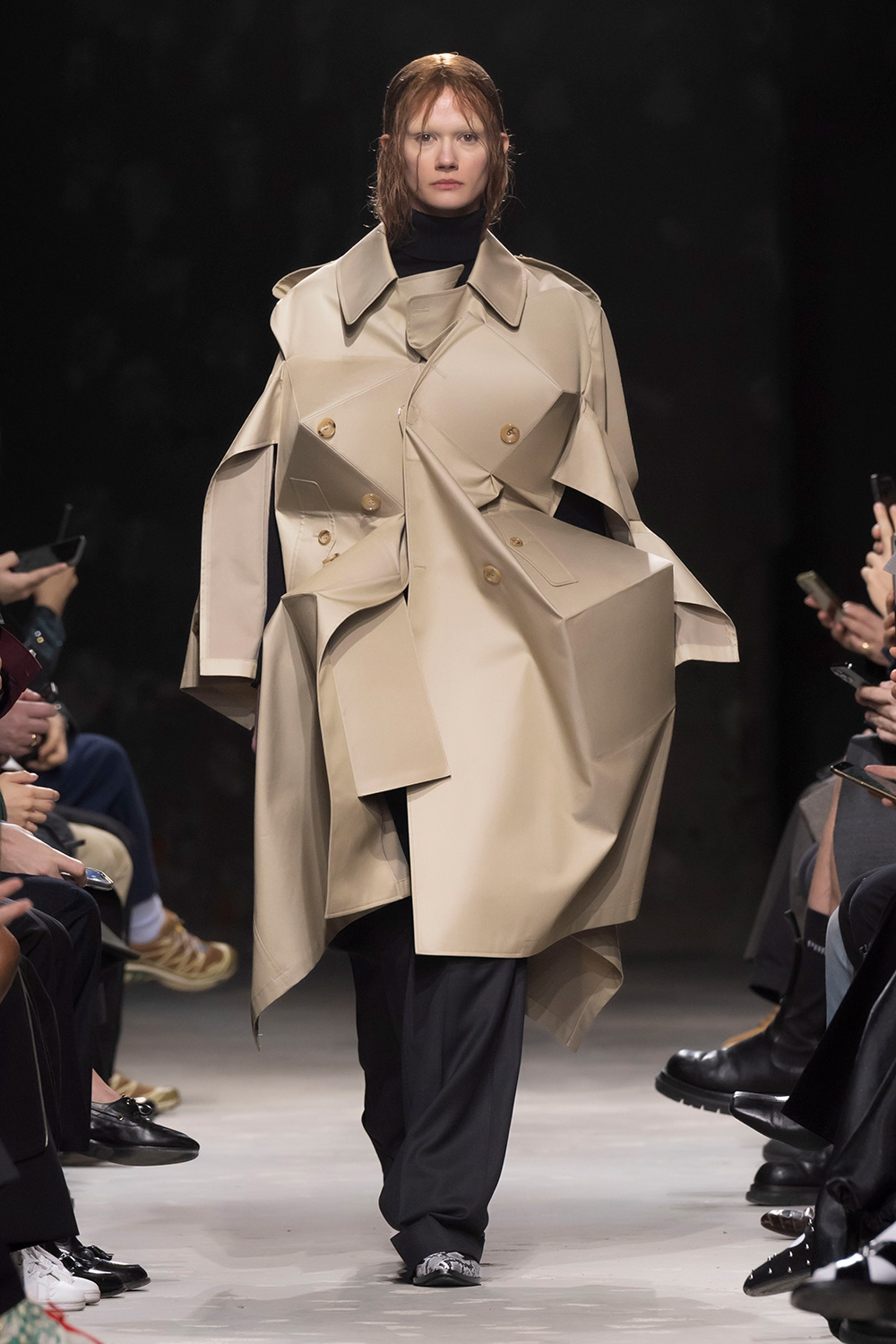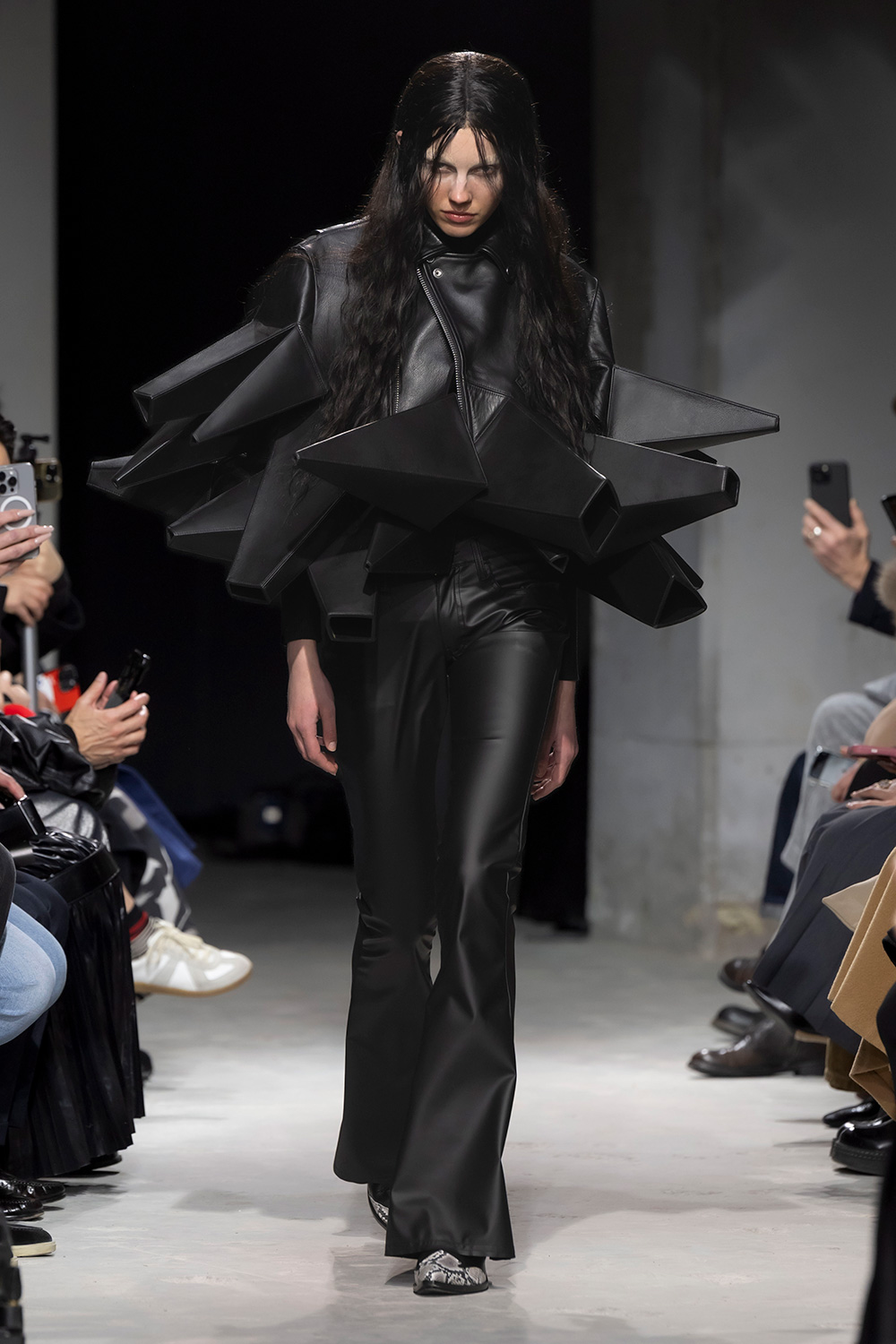 「非リアルな服作りに魅了される」という渡辺淳弥は、身近な服をキュビズムの視点で再考した。ライダースジャケットやトレンチコート、ベルベットのドレスは立方体やトゲのような形が飛び出す角張ったシルエットになり、MA-1はたっぷりの中綿でふくれ上がる。そんなドラマチックで幾何学的な造形に目を奪われる。