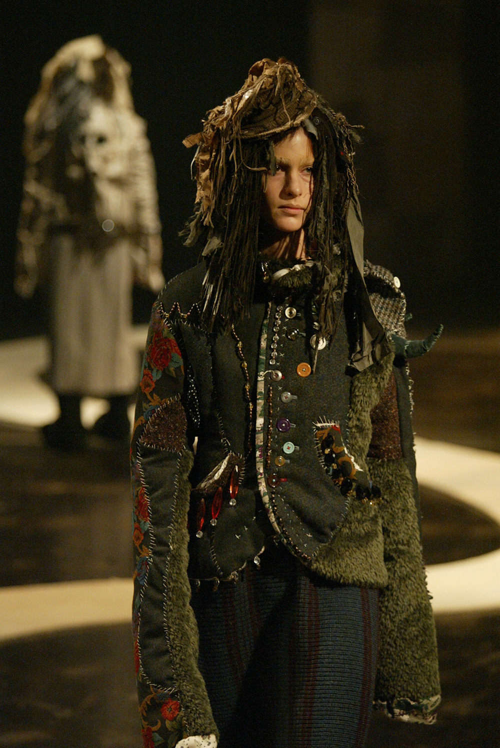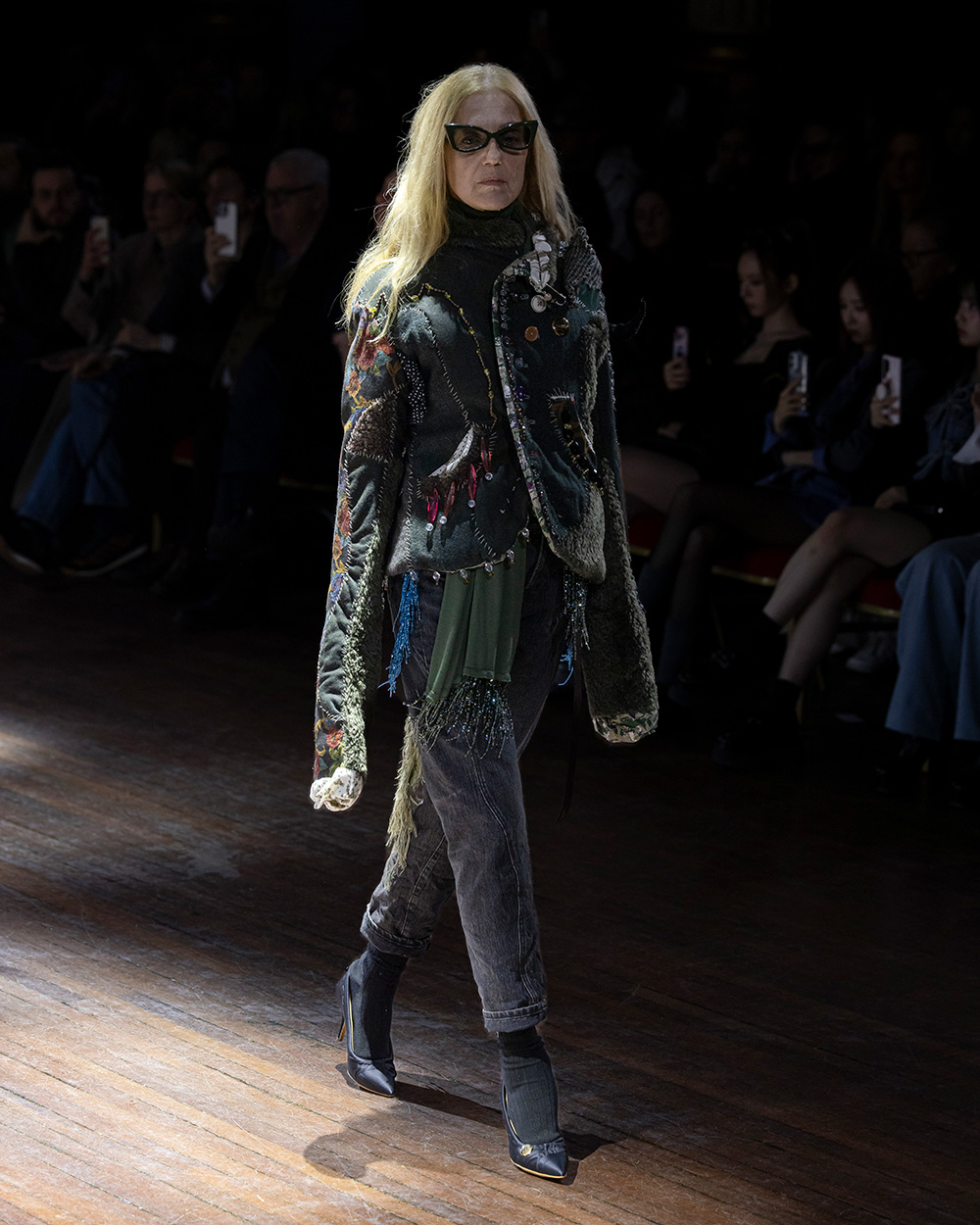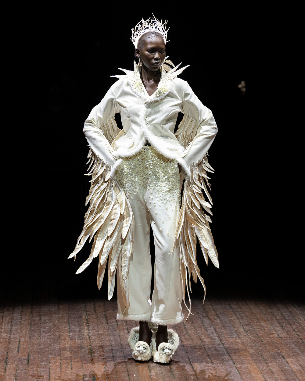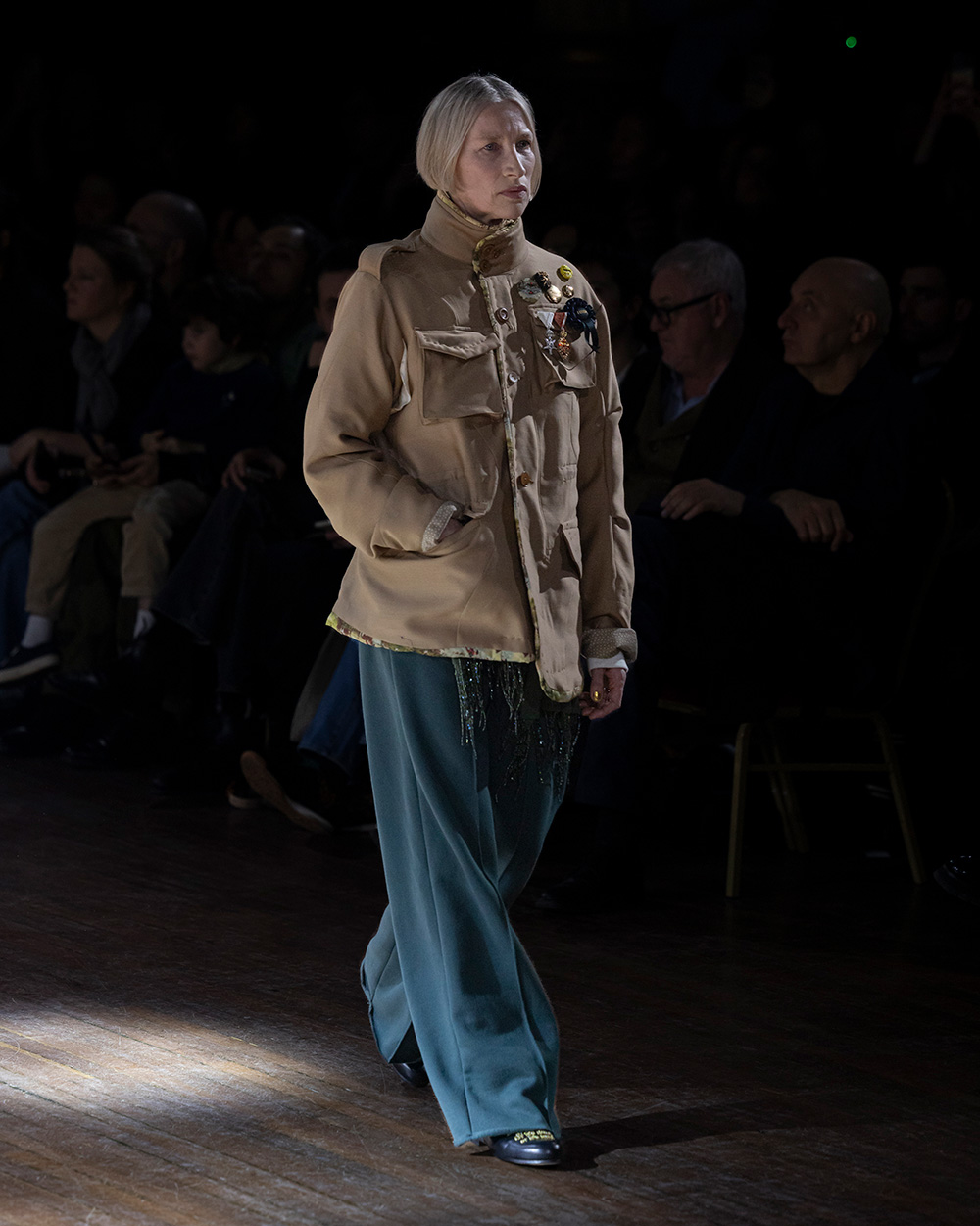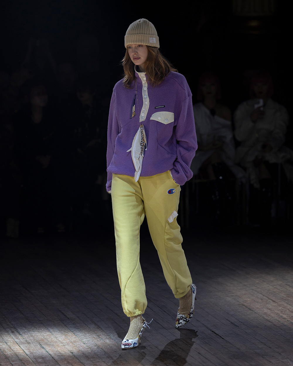 「アンダーカバー(UNDERCOVER)」設立35周年を記念した今季の出発点は、高橋盾が“私的ベスト・コレクション”と考える2004-05年秋冬コレクションだ。それは、アン・ヴァレリー・デュポン(Anne-Valerie Dupond)が作る独創的なぬいぐるみとミュージシャンのパティ・スミス(Patti Smith)の着こなしに着想したもの。同じテーマを元にしつつ、大人のカジュアルスタイルを生むことに取り組んだ。ベースは、「チャンピオン(CHAMPION)」との協業によるスエットアイテムをはじめ、ワークウエアやテーラリング、ニット、ジーンズといった日常着。ただ、うねるような縫い目やバラバラのボタンなど、高橋とデュポンに共通する歪さの中に美を見いだすデザインで個性を放つ。終盤には、動物モチーフのドラマチックな作品をデュポンが制作した靴とともに披露。