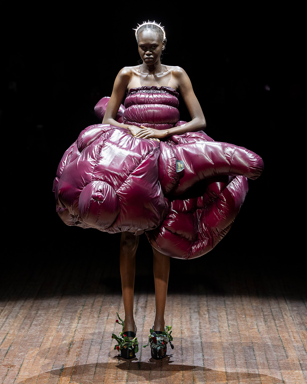 見慣れたものの見方を変え、新たな視点を生むことに挑んだ。ニットの写真をのせたドレスの後に被写体となった彫刻的なニットドレスを見せたり、「どんなものでも体を通せば衣服になるか?」という問いから紙袋風のトップスを提案したり。それは、既成概念を覆す現代アートのよう。