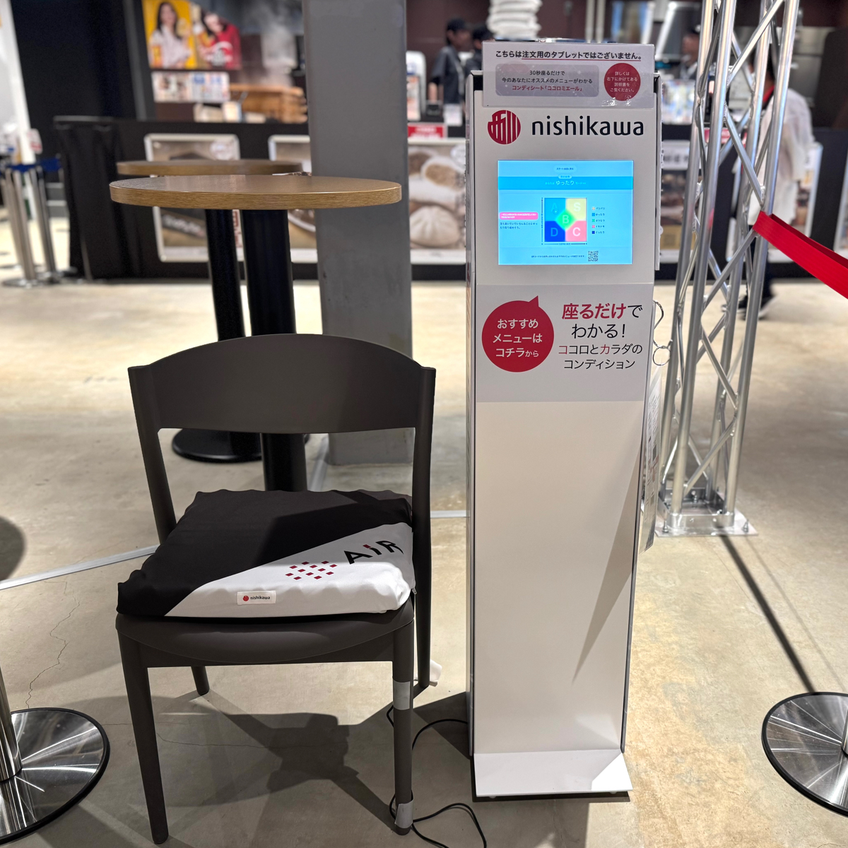 「コンディシート」は、座ると30秒間で自律神経バランスなどのデータを取得する座圧分散クッション。測定結果に基づき、消化に優しいメニューや活力を与えるメニューなど、当日の心身の状態に応じた最適な料理を提案する。導入されるフードコートは、ロボットと人が協働する“未来の飲食店”モデルを体感できるゾーンであり、「食×コンディショニング」の融合によって、未来のヘルスケア体験を提示する場とされている。