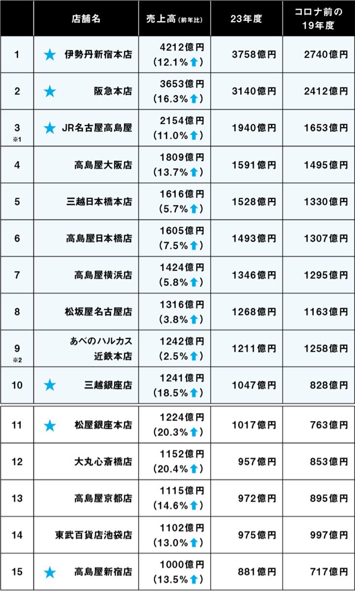 2024年度 百貨店店舗別ランキング(★は過去最高)
