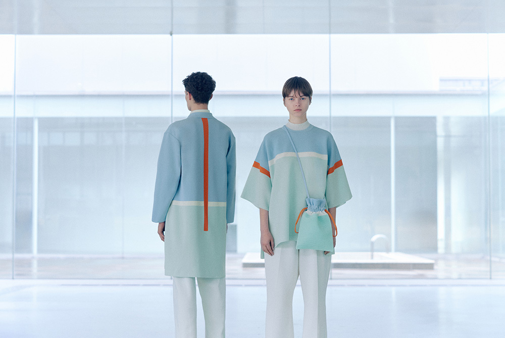 開館以来、当館は時代に合ったユニホームを採用してきた。今回、高橋さんに依頼したのは、再生素材を活用し、サステナビリティへの積極的な姿勢に共鳴したから。高橋さんは、水平ガラスをイメージした涼しげで柔らかな色彩のボーダーに、当館のアイコンカラーのオレンジを用いて、建物を支える柱に見立てたストライプを背中にあしらってくれた。デザインは、展示作品と競合することなく調和しながらも独自の存在感を放ち、来館者にとって心地よい空間を演出している。ユニホームとして遠くからでも一目で分かるため、お客さまの評判も上々だ。