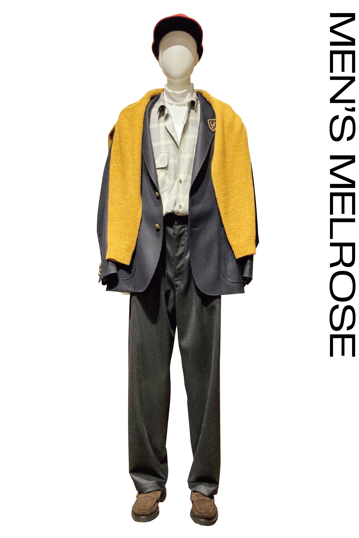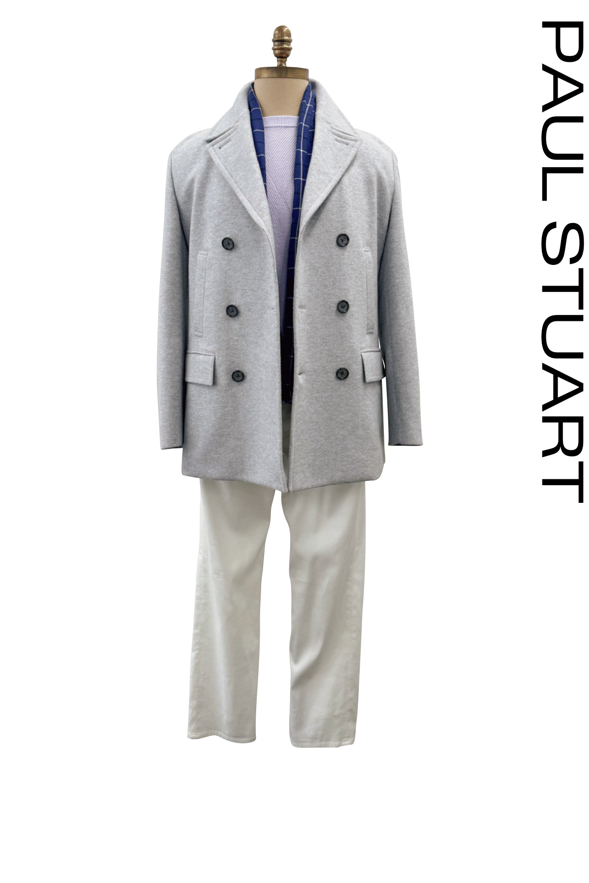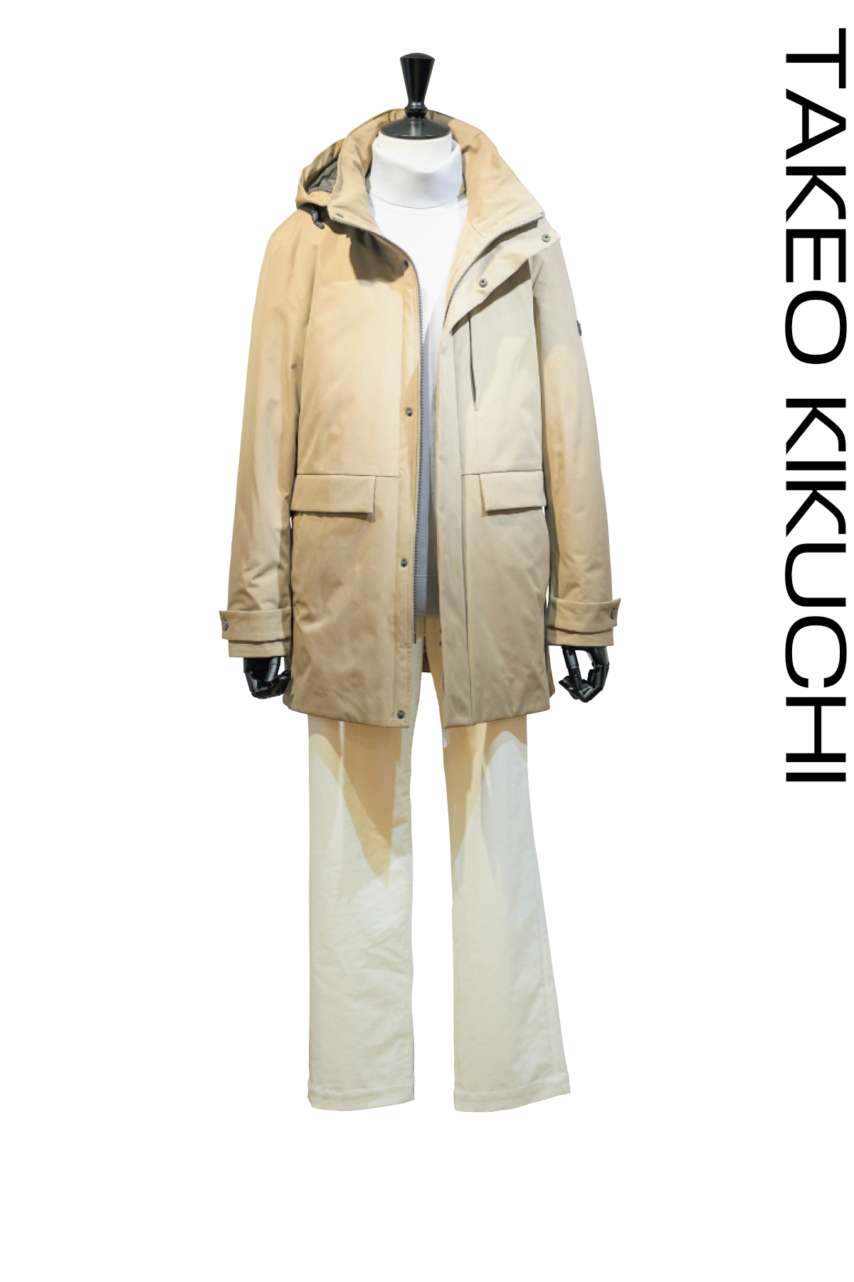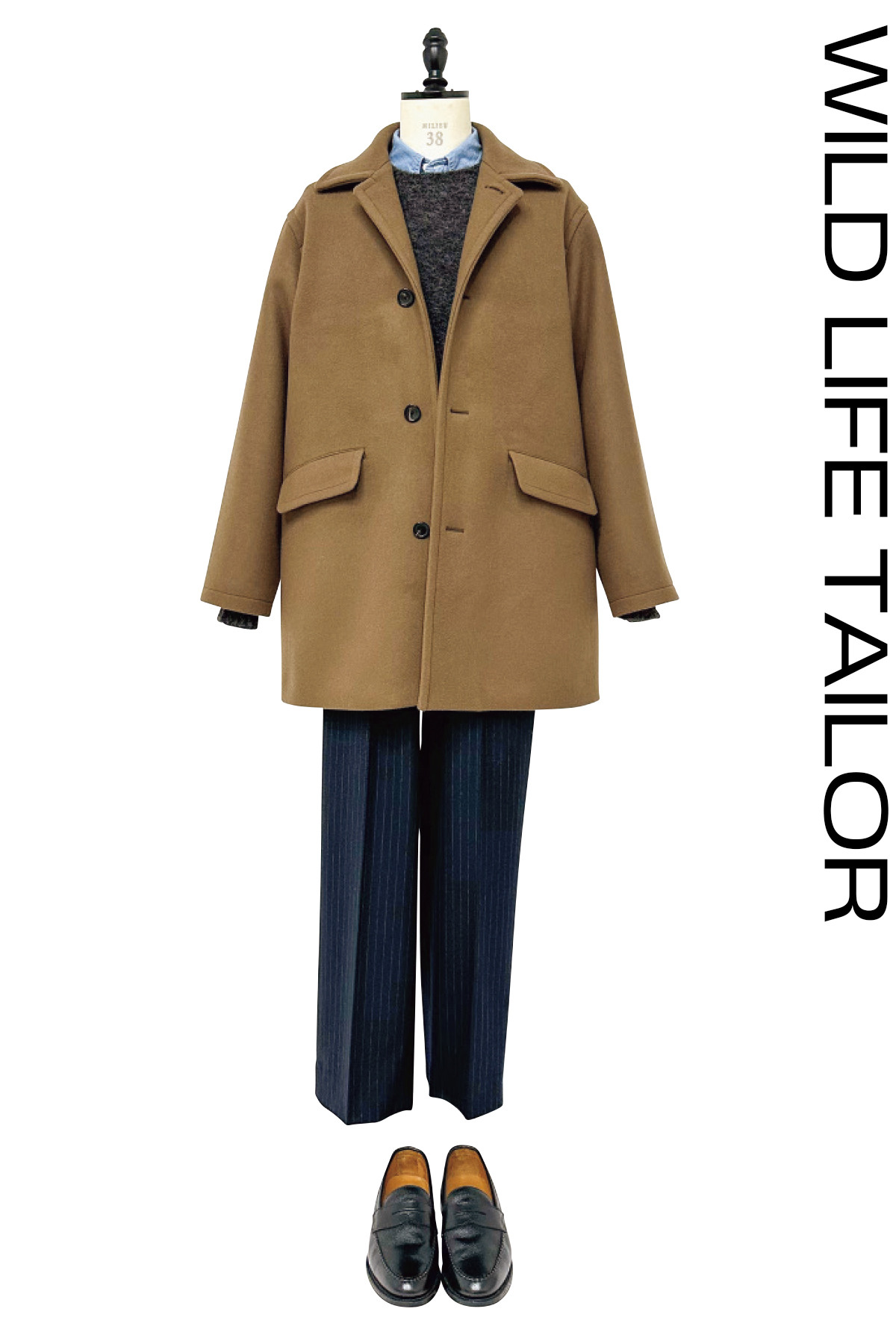 今季は、気温変化に対応しやすい“調温”を意識した軽やかなアウターをメーンに打ち出す。ピーコートは、ビーバー素材にカシミヤをブレンドし、コートというよりは軽い羽織りとして提案。合繊スタンドコートは、昨年の中綿ライナーからダウンライナーに変更した。ライナーを着脱できる仕様にすることで、暖冬から本格的な寒さまで対応する。