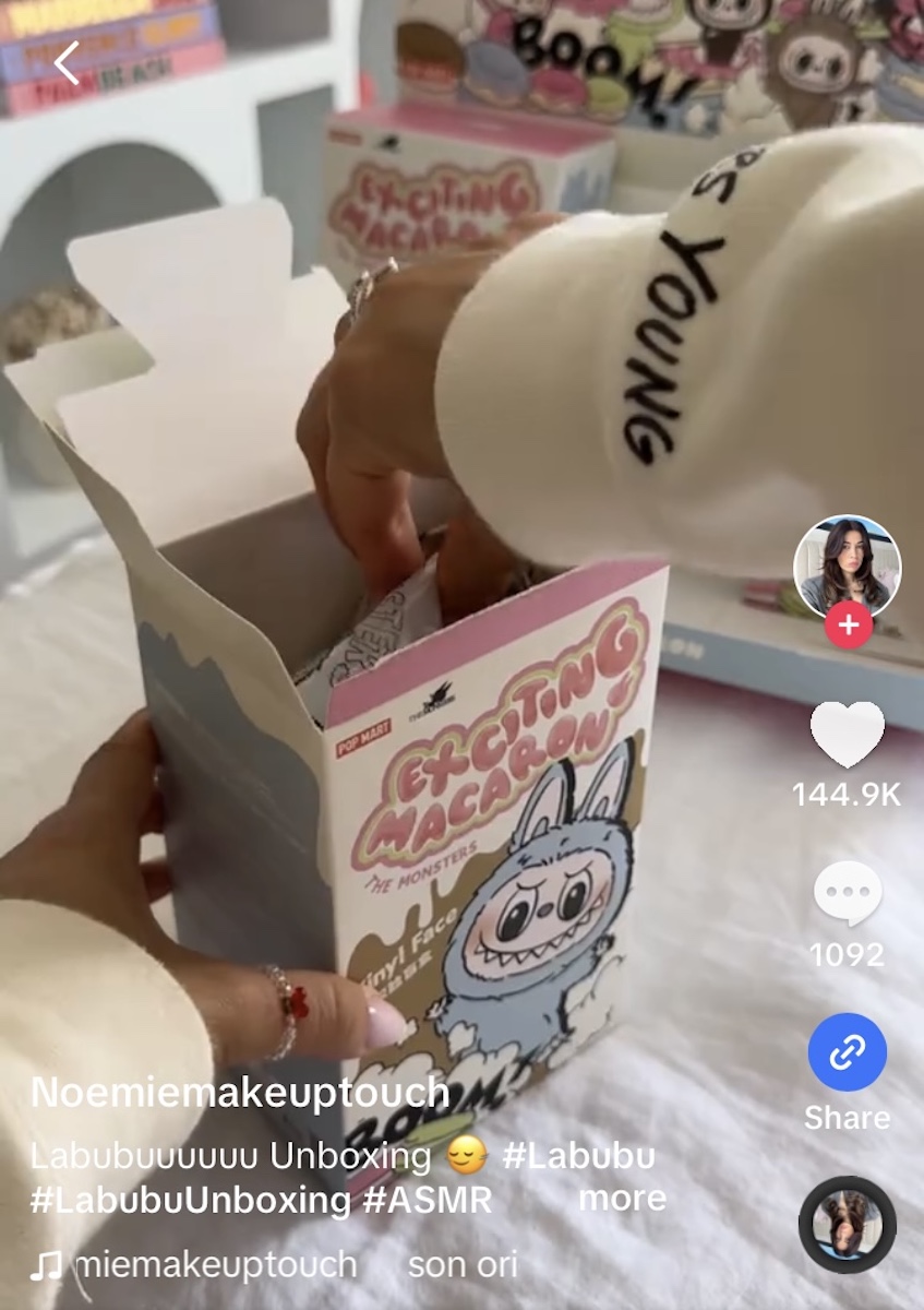 「ラブブ」がこれほどまでに注目度を高めた理由の一つに、ポップマートによるブラインドボックス戦略がある。箱を開けるまでどのフィギュアが入っているか分からないというガチャガチャのような仕様で、購入者に驚きと発見を与えて気分を盛り上げる狙いだ。各シリーズには標準的なフィギュアのパターンのほかに、少なくとも一つ以上のシークレットフィギュアを入れており、入手困難さがコレクター心に火を付けてきた。ブラフIP担当者いわく、「これは単なる製品に体験価値を持ち込み、他者とその体験を共有したり、商品を交換したりする楽しさを演出する。また、ポップマートが売り出す新たなキャラクターと世間とのエンゲージメントを即座に築く効果もある」。SNS上ではインフルエンサーの多くがブラインドボックスの開封動画を投稿している。