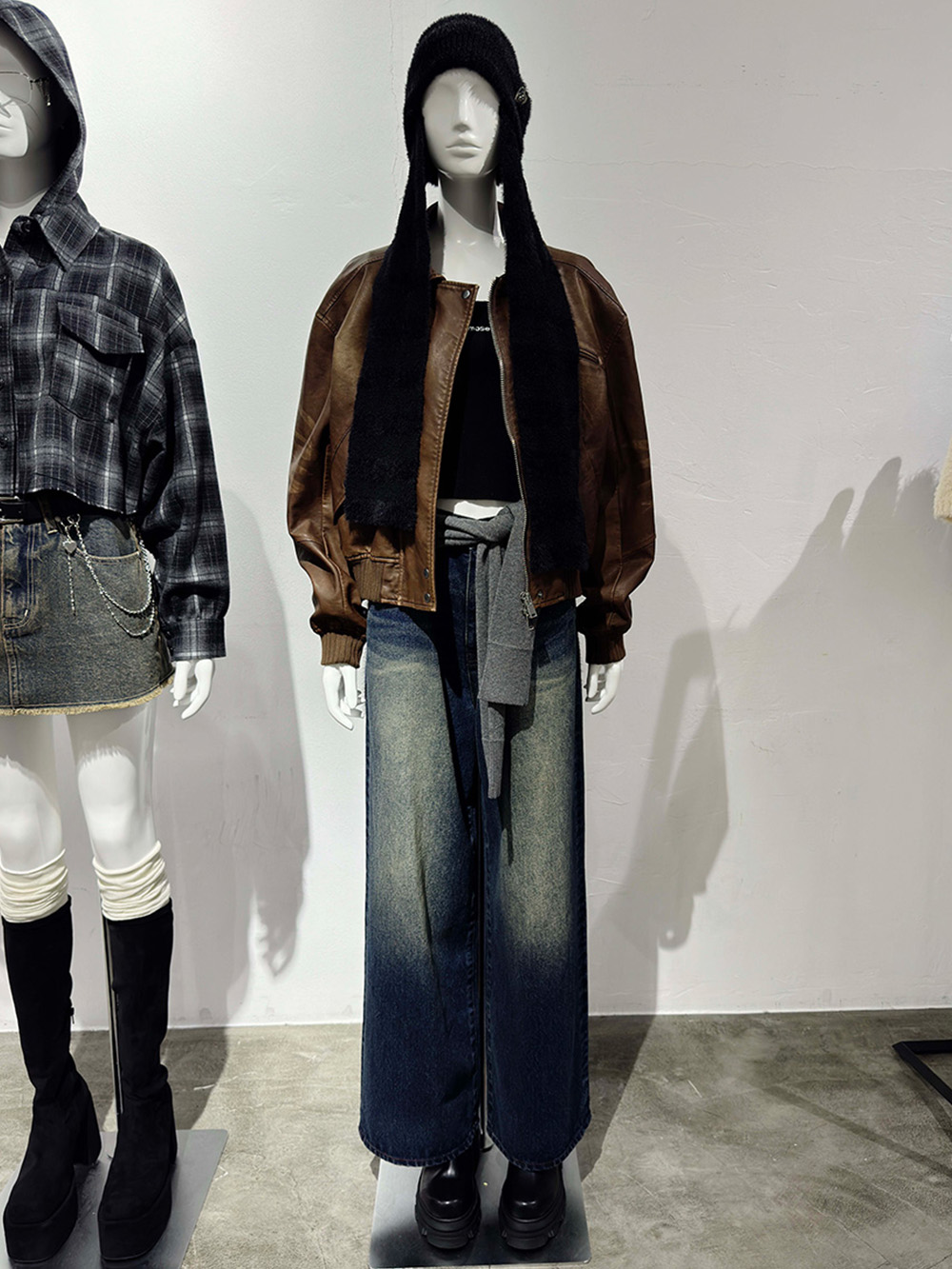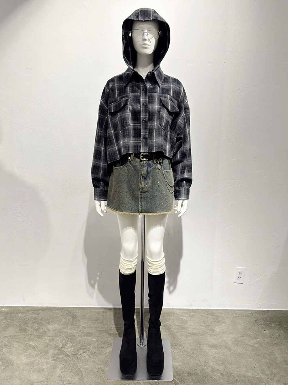 今季の「エモダ」の打ち出しは、レザーブルゾンにデニムのワイドパンツ(画像1枚目)、チェックシャツにデニムのミニスカート(画像2枚目)といったように、アイテム単体は至ってベーシック。それらを、アイウエアやソックス、チェーン、ニットベルトといった小物使い、「チェックシャツはボタンを閉めて1枚で」「首周りやおなかを見せて抜け感を」といったスタイリングをもって完成させる。