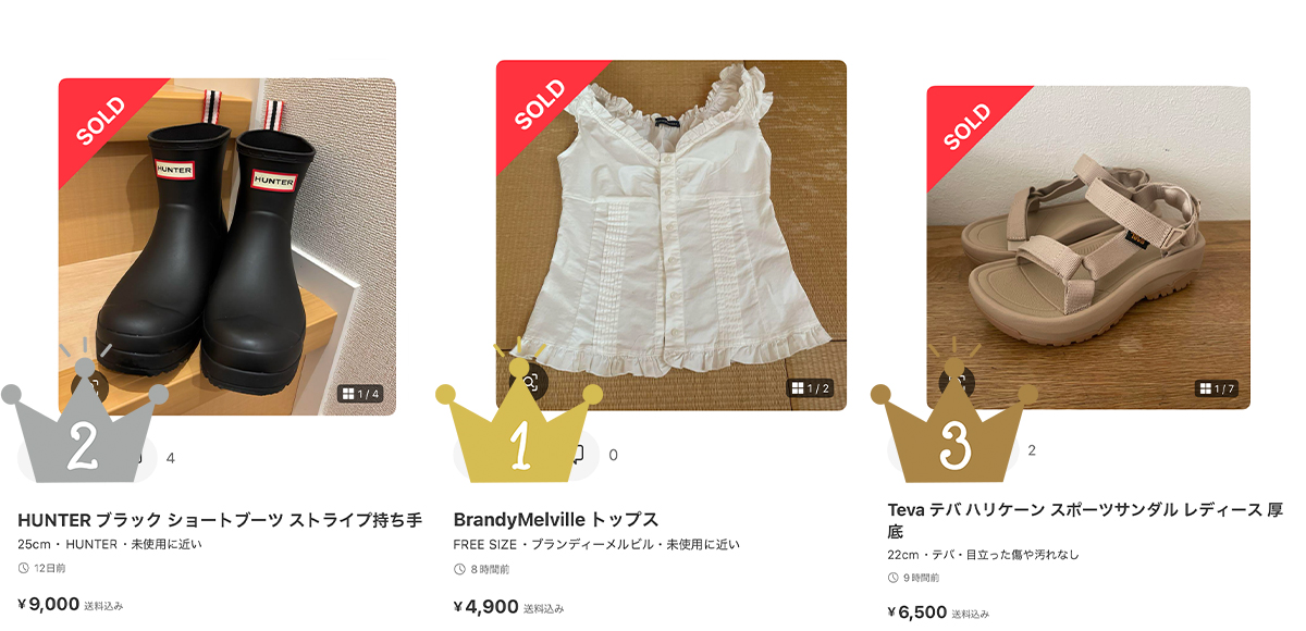 レディースで1位の「ブランディーメルビル」はイタリア発のLAカジュアルテイストのブランド。国内では1店舗のみ。夏らしいアイテム目当てで取引数が急上昇したようだ。メンズ、レディース共に「テバ(TEVA)」のサンダルが上位3位にランクイン。ソックスと合わせてスタイリングを楽しめる。レインブーツ「ハンター(HUNTER)」や晴雨兼用傘「Wpc.」といった梅雨対策の動きも堅調だ。