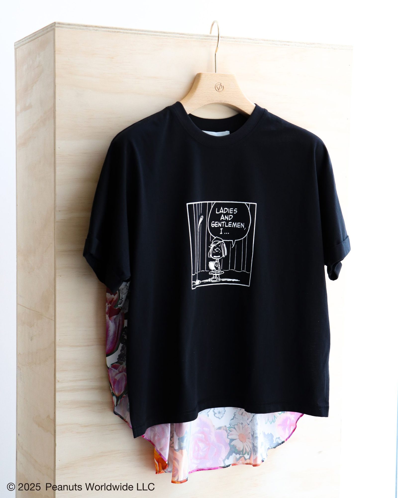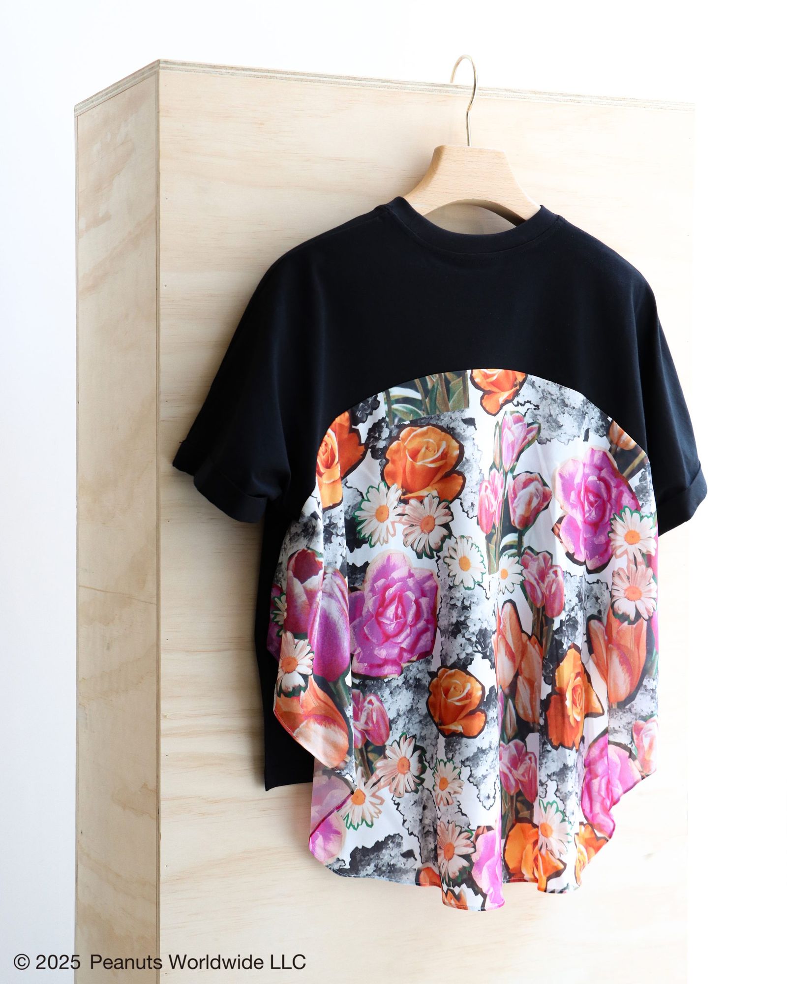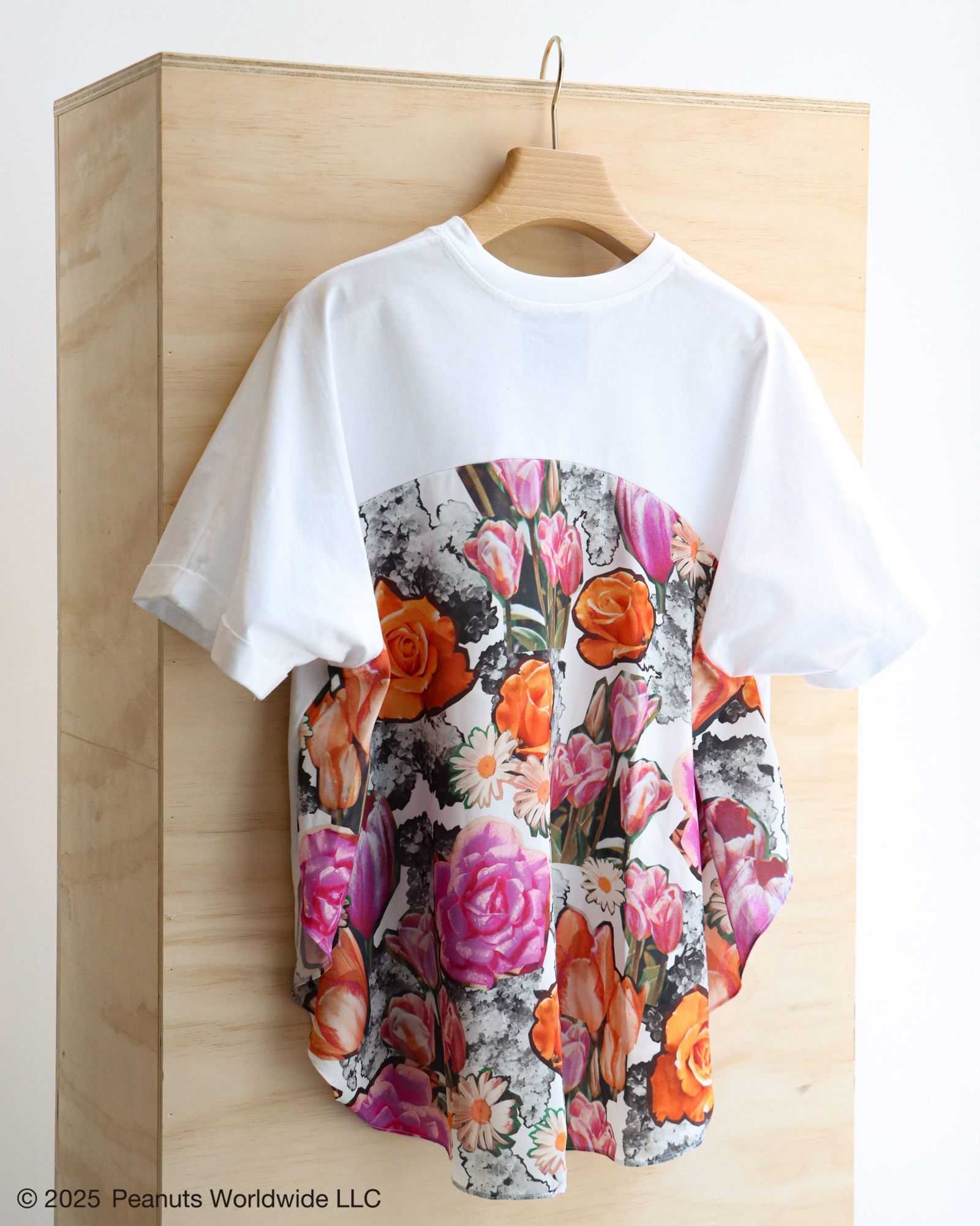 Tシャツは、フロントにキャラクターのペパーミント パティのイラストをシルクスクリーンプリントし、バックは光沢感のあるバラのコラージュのプリント生地を合わせた。ホワイトとブラックの2色展開で、サイズはXS〜M。価格は各3万8500円。