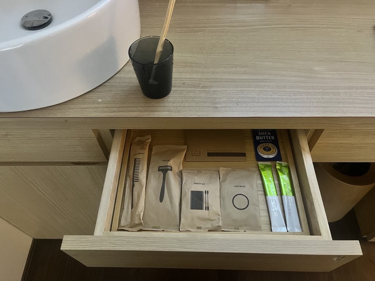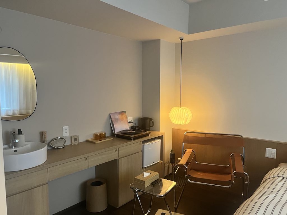 街ナカホテルに広さは必要ない。私が滞在した「スロールーム」、は極めてコンパクトなつくりで、壁面のカウンターに洗面台が設置され、デスクやバーカウンターを兼ねている。