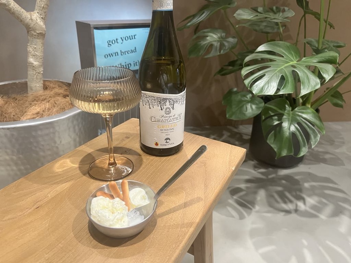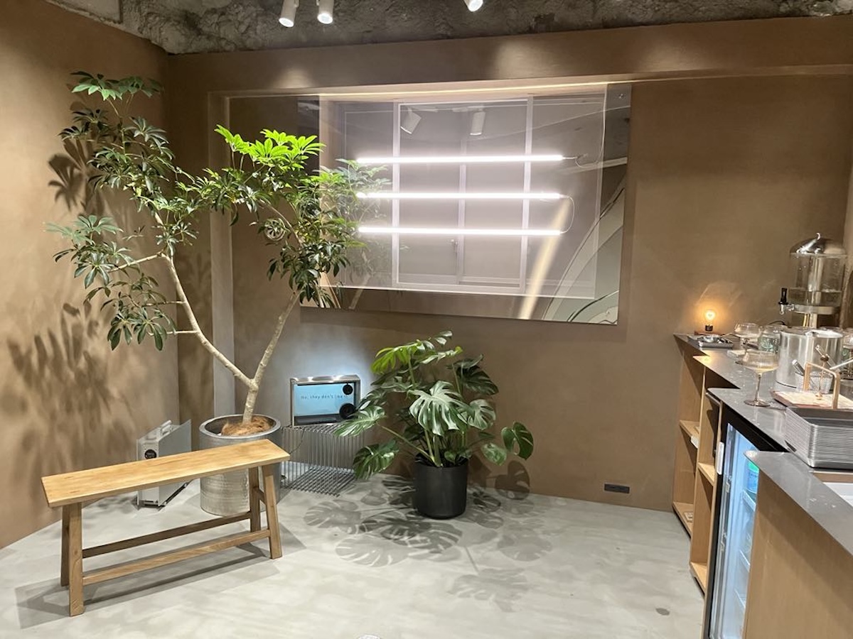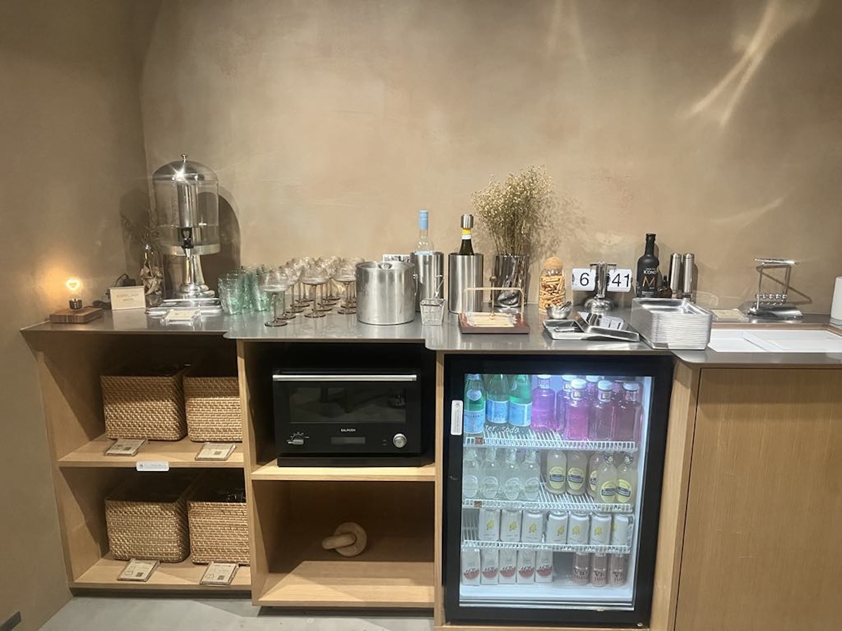 私が実際に滞在して、一番うれしかったのが、エントランスすぐのコンパクトなラウンジだ。カウンターにはキンキンに冷えた白ワインが2本。デトックスウォーターもあり、外出から帰ったとき、サウナでほぐれた後にふとくつろげるセルフバーでもある。冷凍ケースにはマスカルポーネのアイスクリームが。これにオリーブオイルをかけて食べるのが美味!塩が効いたビスケットや胡椒をかけるのもなかなかいい。エントランスを抜けてすぐにあるこのラウンジ、なぜか人の気配がなく、サウナ帰りの女の子2人組にしかすれ違わなかった。フロントがないので、必要がない限りスタッフとも会うこともない。人の気配はないのに、なぜかぬくもりを感じるこの空間は「エトエ」のイメージそのもののように感じる。