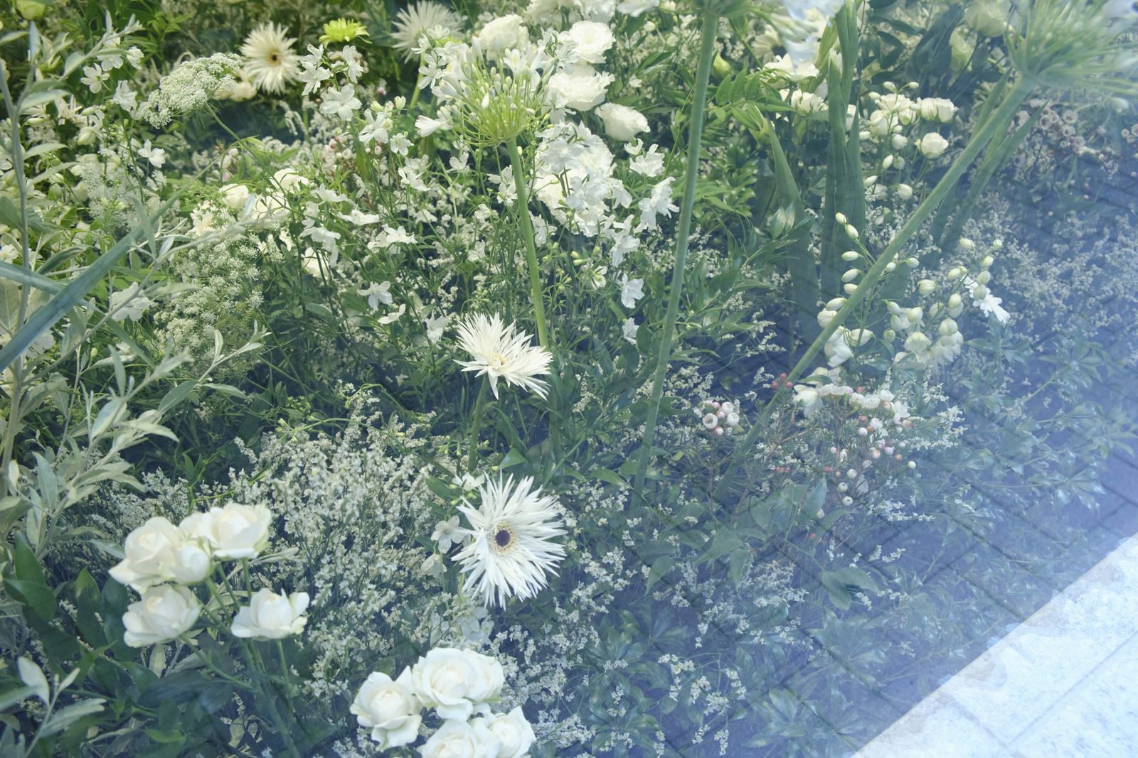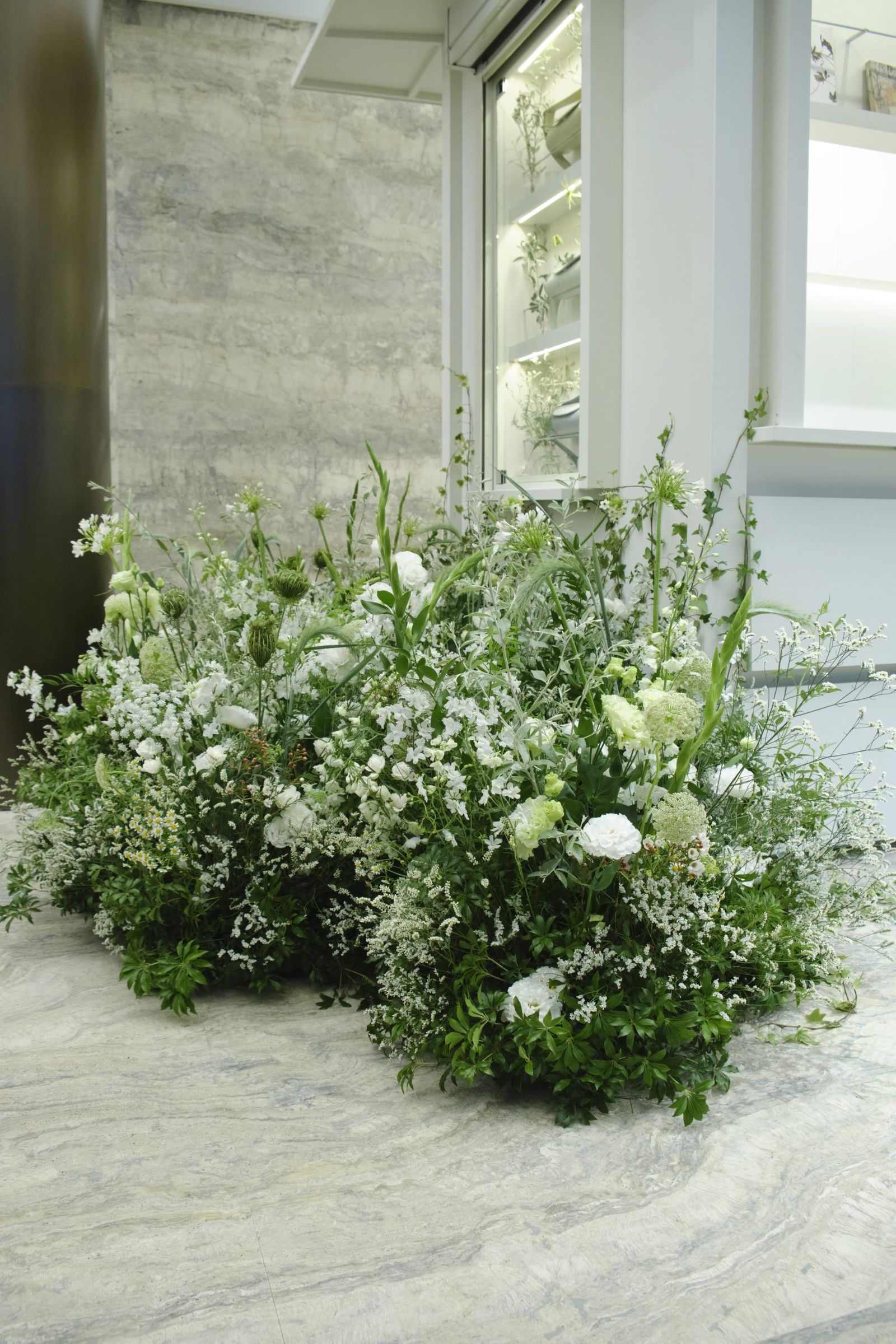 全体は、3部で構成する。7月25日〜8月11日の期間は、「ワイルドガーデンの息吹」をテーマに店内のアートスペースには、野原を思わせるようなグリーンを用いた「ワイルドガーデン」が出現し、「フラワーキオスク」という白い花を使用した作品を展示する。
